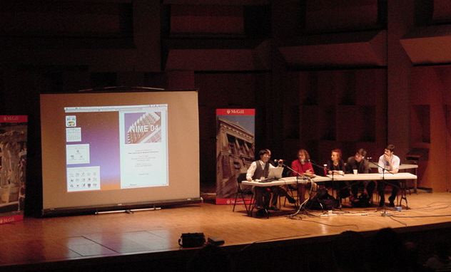 そしてこの2002年にはタナカアタウ(ずっと友人、1999年には一緒に IPSJ SIGMUS Tutorial の講師を担当、2023年には エディンバラ で再会)などNIME steering committee から「日本でNIME開催を」との打診を受けて、2003年にかけて水面下での作業がスタートしていた。 まず最初に、中央官庁とのツテを経由して、国際交流基金と文化庁と外務省との膨大なやりとりを経て、何も出ないものの「名義後援」をいただいた。 それを掲げて、スポンサーとしてローランドとヤマハを攻めて大きな助成を受けることで、なんとか僕が大会委員長としてSUACでNIME2004を開催する目処が立ってきた。 モントリオールに学生と行った NIME2003レポート によれば、僕は研究発表の採択 Bio-Sensing Systems and Bio-Feedback Systems for Interactive Media Arts とコンサート部門の入選 Quebec Power (ベルリンでゲットしたBass Recorderを演奏)のダブルで研究発表とコンサート公演をやりつつ、さらに総会の壇上で翌年の大会委員長として「来年は浜松においで下さい」という招致演説をしていたのだ。 小さくて見えにくいものの、以下の写真はその模様である。 そしてようやくこの準備が、東野さんとまりさんがSUACにやってきた翌年の NIME2004 に繋がるのだった。