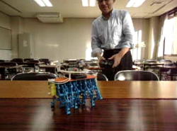 もちろんこれでは面白くないので、前回の「リモコン操縦」Arduinoスケッチにレバースイッチのセンシングを加えて、ちょっと安易なものの「両方のスイッチがON(机に押し付けられている)の場合にはリモコン操縦データをモータにおくる」・「それ以外の場合にはリモコンから届いていたモータ制御データを反転して1000msecだけ移動してから元に戻る」という単純なアルゴリズムにした。 それでもまずまず動作したので、これを教室で生徒のPCに提供できるようにFATフォーマットのUSBメモリにコピーして、準備は完了した。