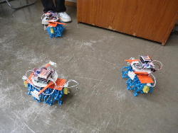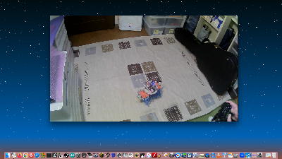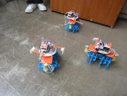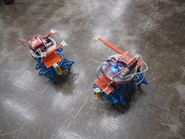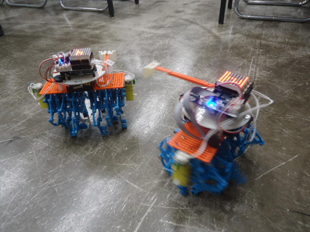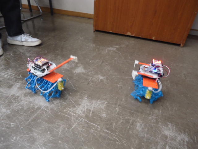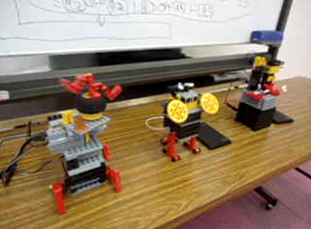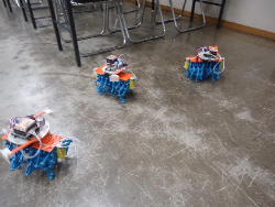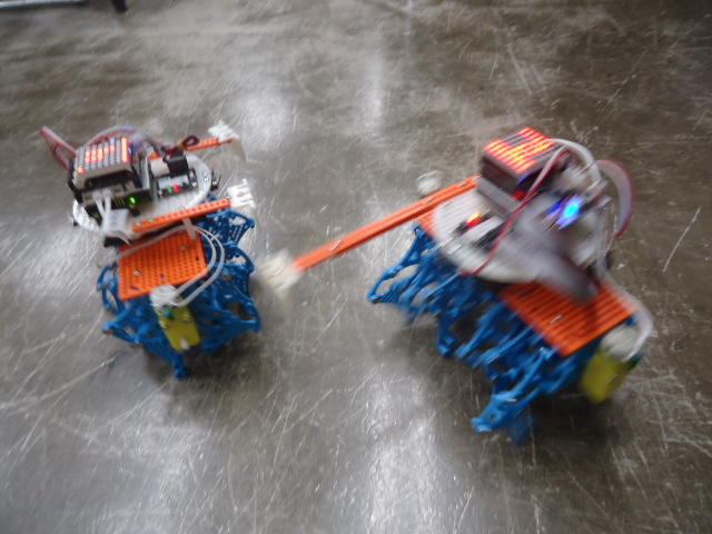 ところが午後のアドバンスは、振替のため2人だと思っていたところ、朝の出掛ける直前に家族から「体調不良のため本日欠席→振替」というメイルが届いて、珍しく「たった1人」となる事が確定した。 3人いれば輪唱になるが、2人ではちょっと寂しい。 そこで、 この動画 のシステムを急遽、会場に持参して、作っていたロボットのプログラムを書き込んで、会場のパーツを適当に組み立てて「もう1台」を臨時に制作した。