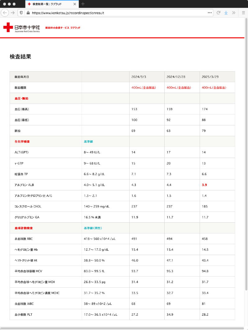過去には献血日から1ヶ月ほどして届いていたハガキだったのが、現在は翌日には献血の結果がスマホや「ラブラッド」で過去3回分まで見られる。 上のように今回の結果はこれまでで一番良好で、内科のコレステロール血液検査結果も、「総コレステロール=166mg/dL」・「善玉コレステロール=72mg/dL」・「悪玉コレステロール=75mg/dL」・「中性脂肪=95mg/dL」と、これまで出たことの無い良好な結果だった。
