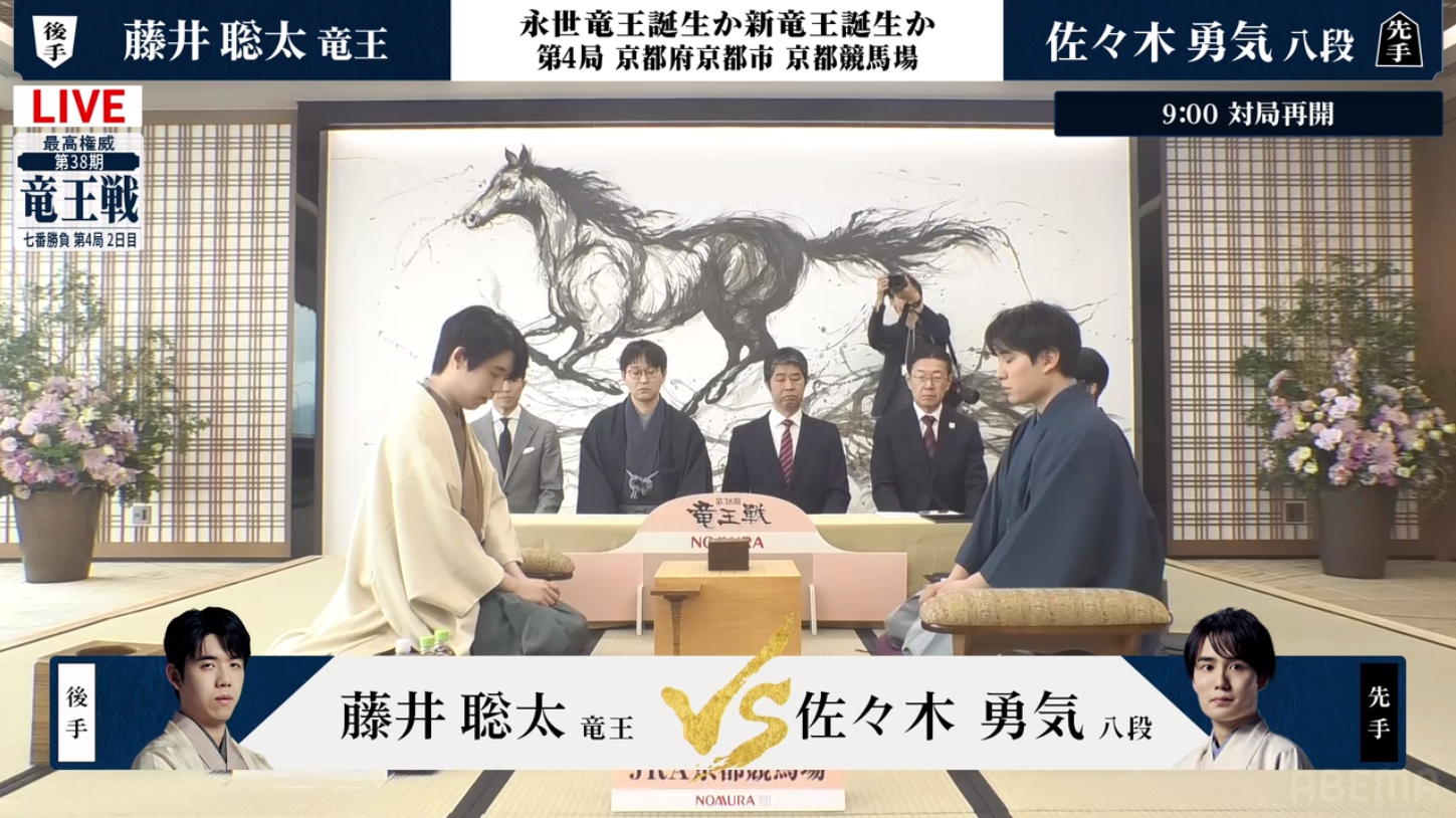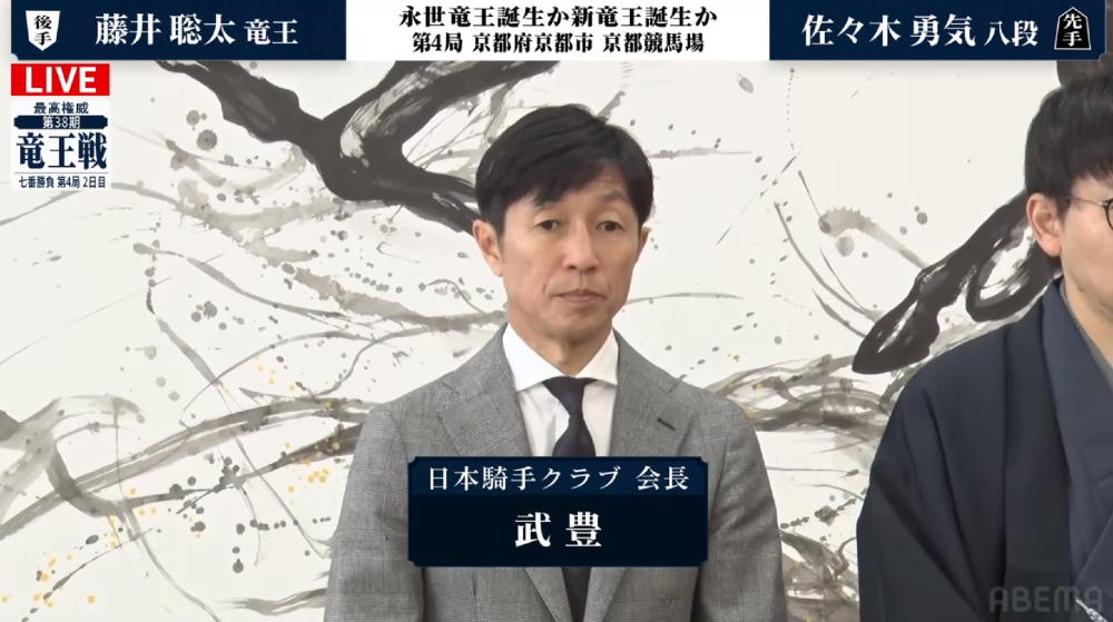 そして竜王戦第4局2日目の朝となった。 考えてみればここで勝つと、藤井竜王は単にタイトル保持というだけでなく、5期連続の「永世竜王」となり、それも渡辺九段の記録を抜いて最年少永世竜王という記録となるのだった。 AbemaTVの生中継を見てみると、なんと立会人の並びにレジェンド武豊騎手の姿もあった。
