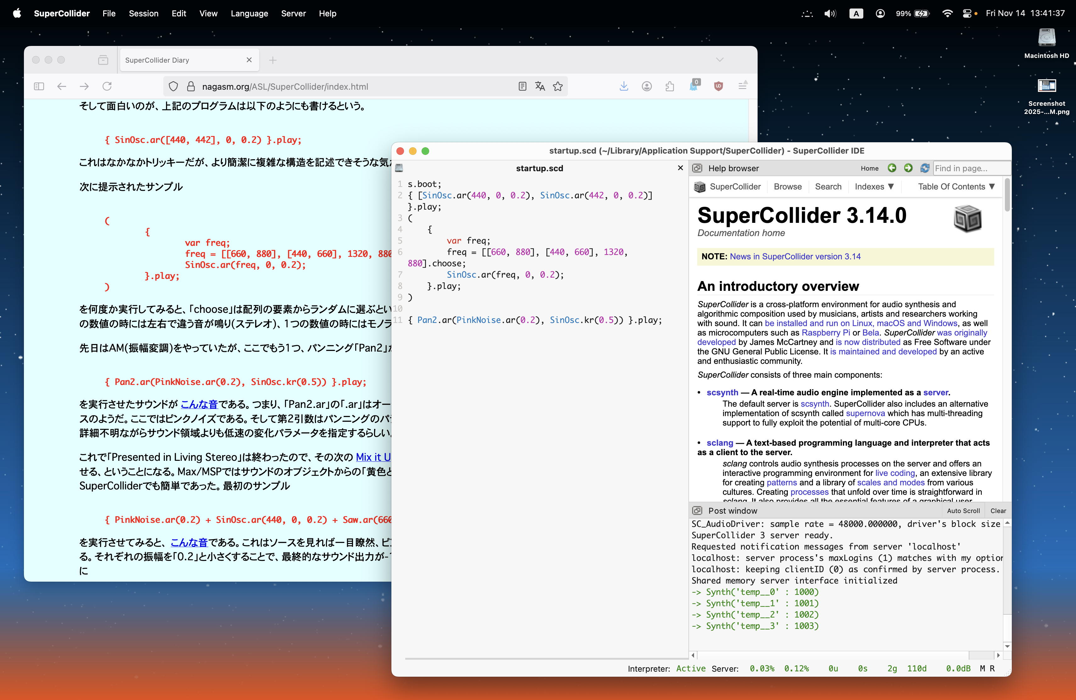 そこで調子に乗って上のように、新MacBookAirにSuperColliderも入れてみた。 最新のSuperColliderはVersion3.14.10となっていたが、過去の SuperCollider日記(1) からサンプルスケッチを呼び出すと(「選んで+コマンド+リターン」で鳴る、「コマンド+ピリオド」で鳴り止む、というのを10秒ほどで思い出した)、ちゃんとサウンドが鳴ってくれた。