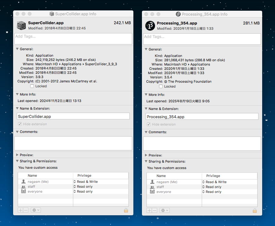 ちなみに現状の「お仕事Mac mini」では上のように、ProcessingはVersion3.5.4であり、SuperColliderはVersion3.9.3ということだったが、まぁとりあえず両者の環境に大きなスキップは無かったので、今後もプログラミングは同じように進められそうだ。