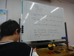 そして生徒はホワイトボードに僕が書いた長大な「楽譜」プログラムを打ち込んで、そのマイコンブロックを使って「自由にロボットにしよう」という特別テーマで制作してもらった。 その結果、上のように、僕のロボットと臨時組み立てロボットと生徒のロボットでの3体による「輪唱」が成立することになった。 現場で2回、一発撮りしたのが この動画 と この動画 である。 まぁまぁ、特殊なケースとなったのだが、この生徒には持参したロボプロRP1の リンクロボット も特別に操縦してもらったりして、「特別な日」を無事に乗り切ることが出来た。