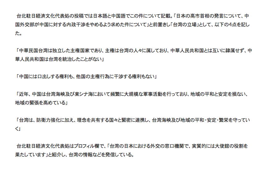 上のように、「矜持」という言葉の重みを久しぶりに感じるニュースが届いた。 「台湾は独立した主権国家、中国は台湾を統治したことがなく、中国は口出しする権利ない」 。 なんという明確で真摯な言葉だろう。 素晴らしい。