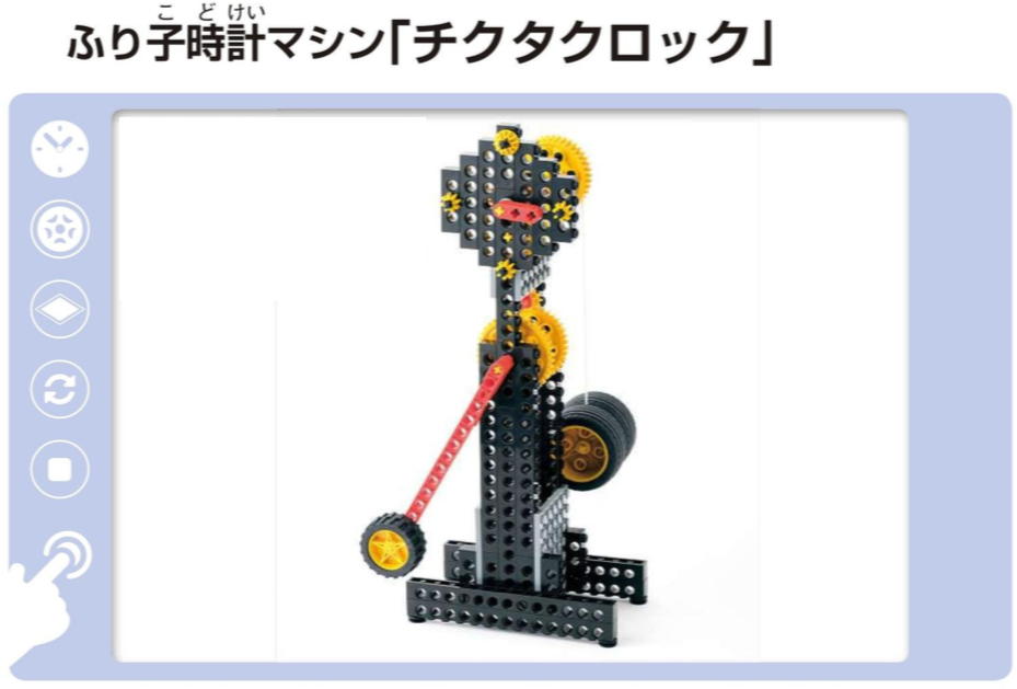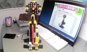 ロボット教室・ミドルクラスでは1回目で「ロープウェイ」のようなロボット(紐をピンと張ったところにぶら下がって移動)だったのだが、2回目に向けて大幅な改訂作業を行った。 今回の「肝」となるのは、ちょっと小学生には理解が難しい「重心」なのだが、実際に作ってみると、どうも左右に長く伸びた「脚」でバランスさせても、重心が微妙に支点(ロープ)と同じような高さのために安定しなかった。 そこでテキストに書かれていないが「脚」ブロックをさらに1本追加して、ようやく倒れない「やじろべえロボット」が完成した。 またまた狭い部屋の半分くらいを使って 記録動画 も撮ってみたが、これでだいぶ雑然とした僕の部屋が丸見えになってしまった。