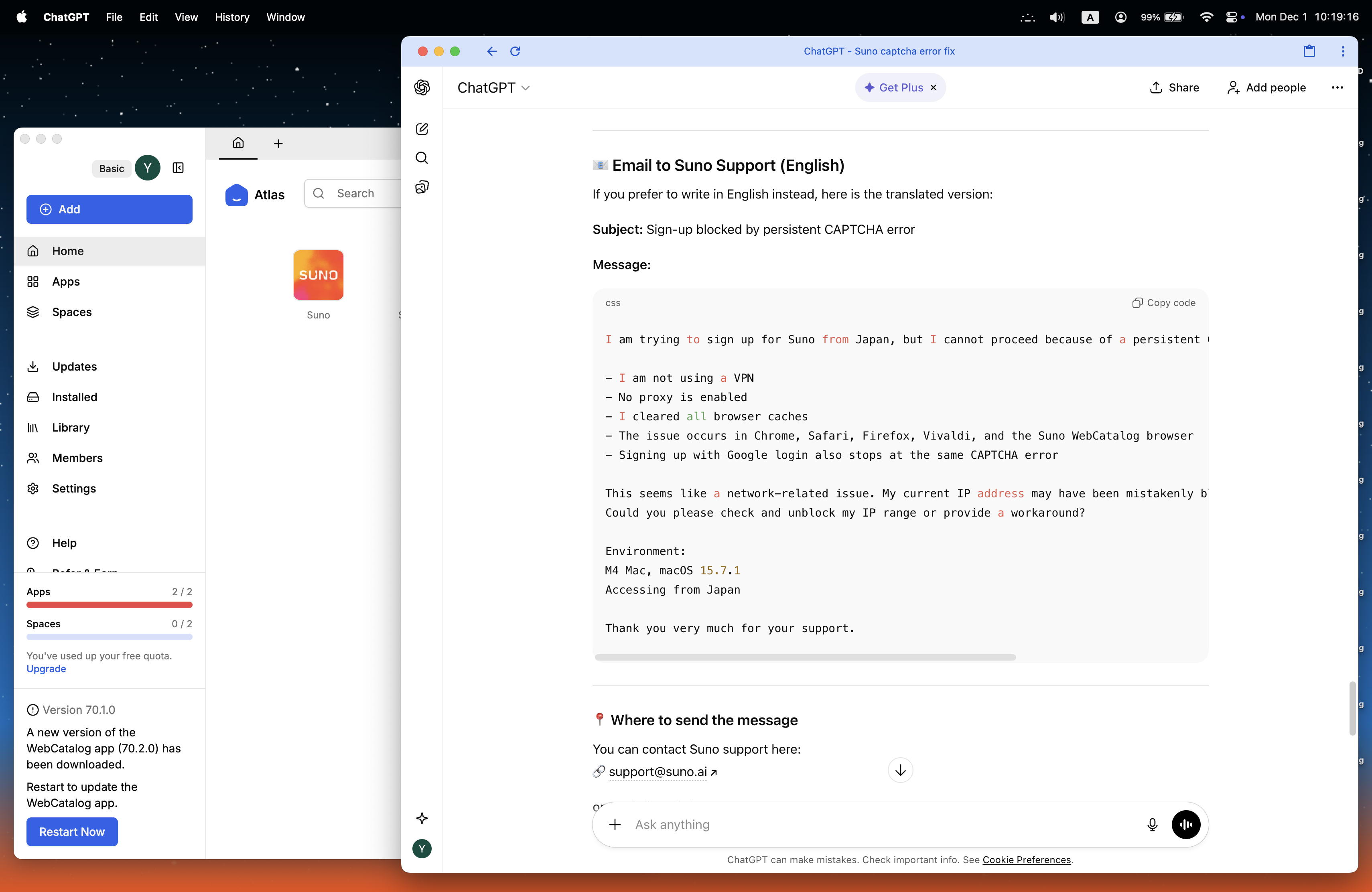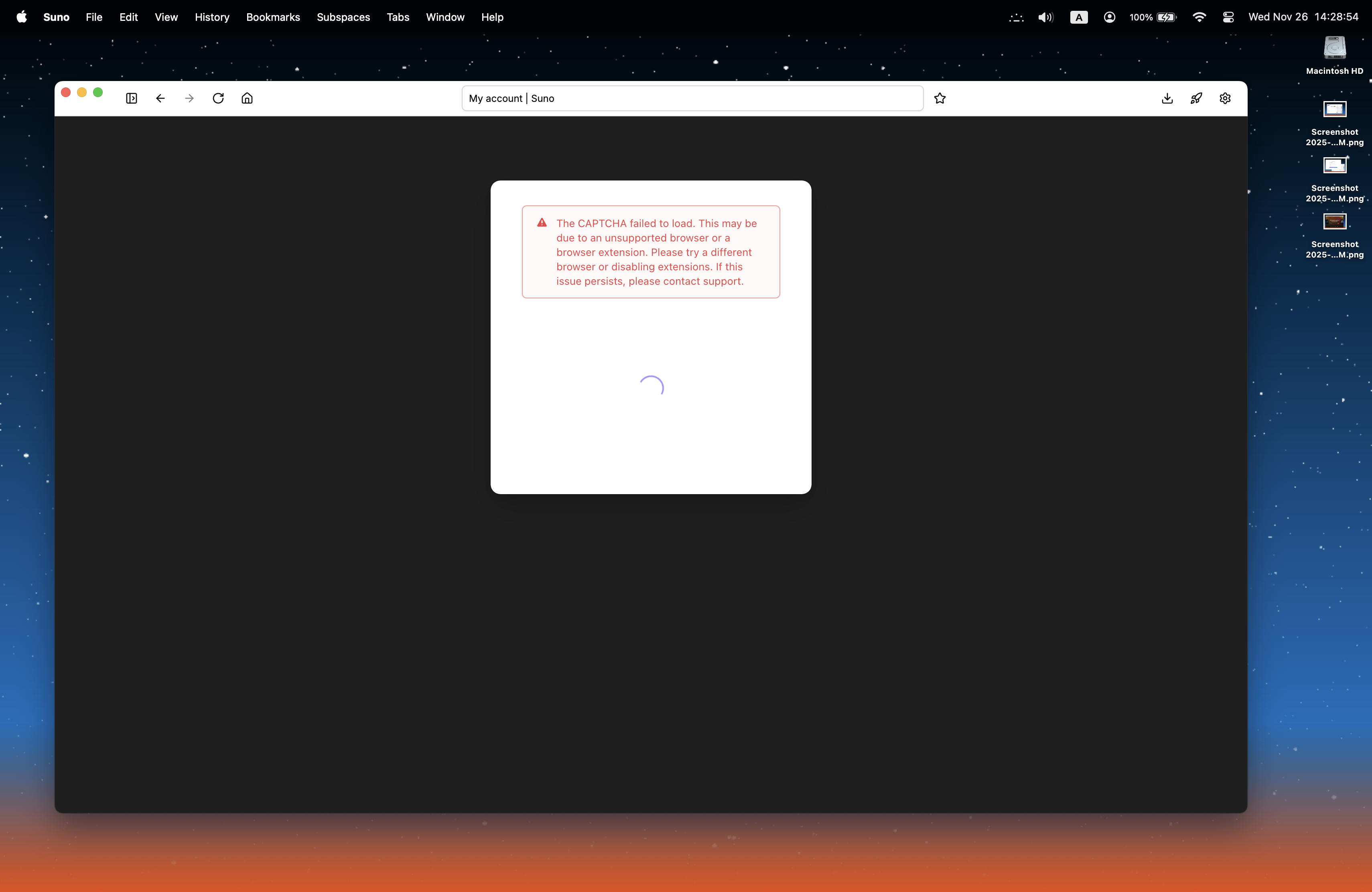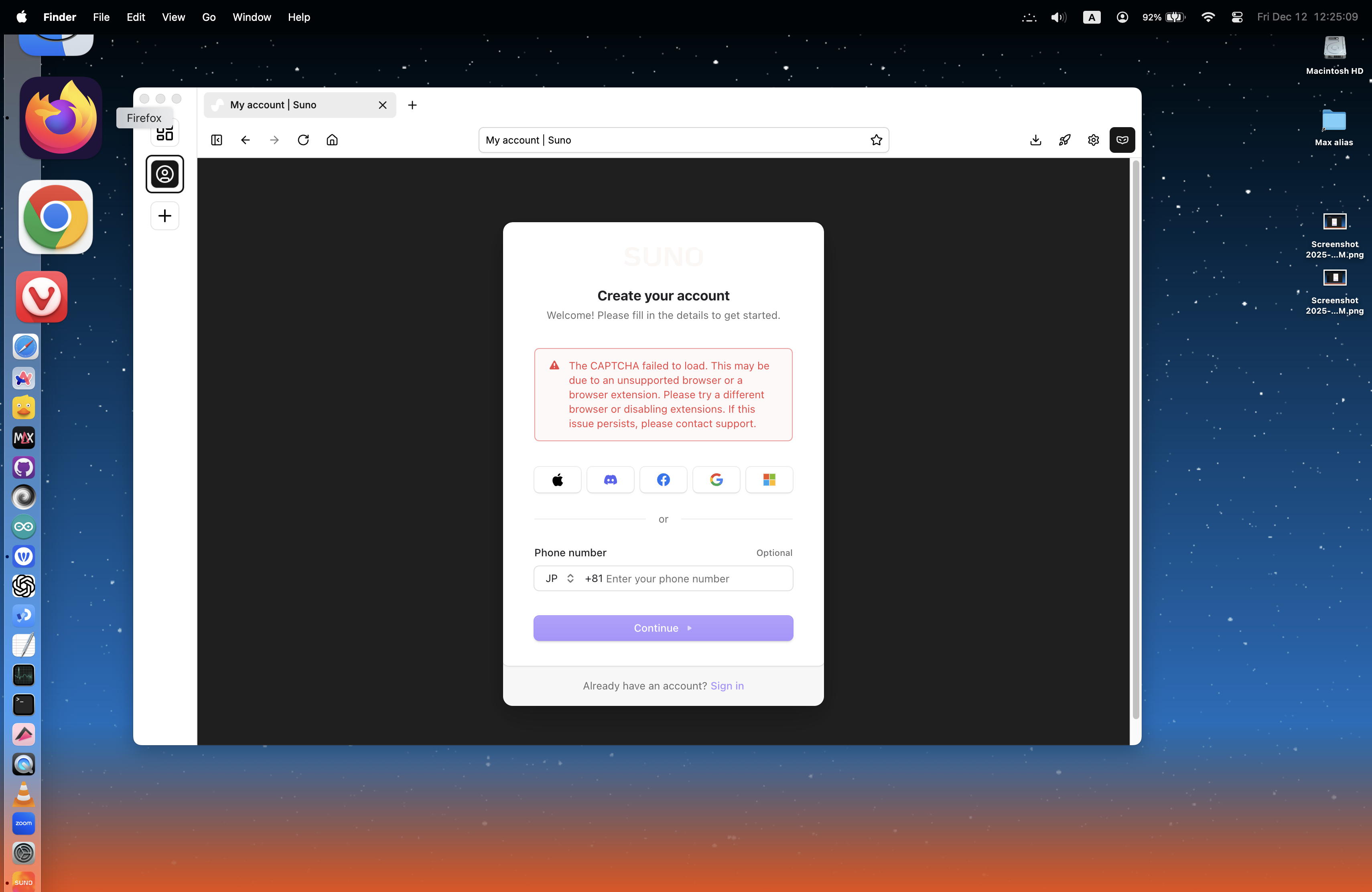 そして、京都精華大の落先生からは来年に向けてある連絡が届いて、いよいよスタートする事になってきた。 その返信で、なんだかsunoがCAPTCHAエラーで困っている・・・と伝えたところ、これまでsunoに連絡した色々な手法を教えてくれたのだが、初めて見る「シークレットウィンドウ(Incognito)で試す」・「Arcの場合」などという情報があったので、Firefoxのプライベートウインドウ、さらに「Arc」という新しいブラウザをインストール、そしてsunoブラウザでのプライベートウインドウ、などを試してみたが、以下のように全て駄目だった。