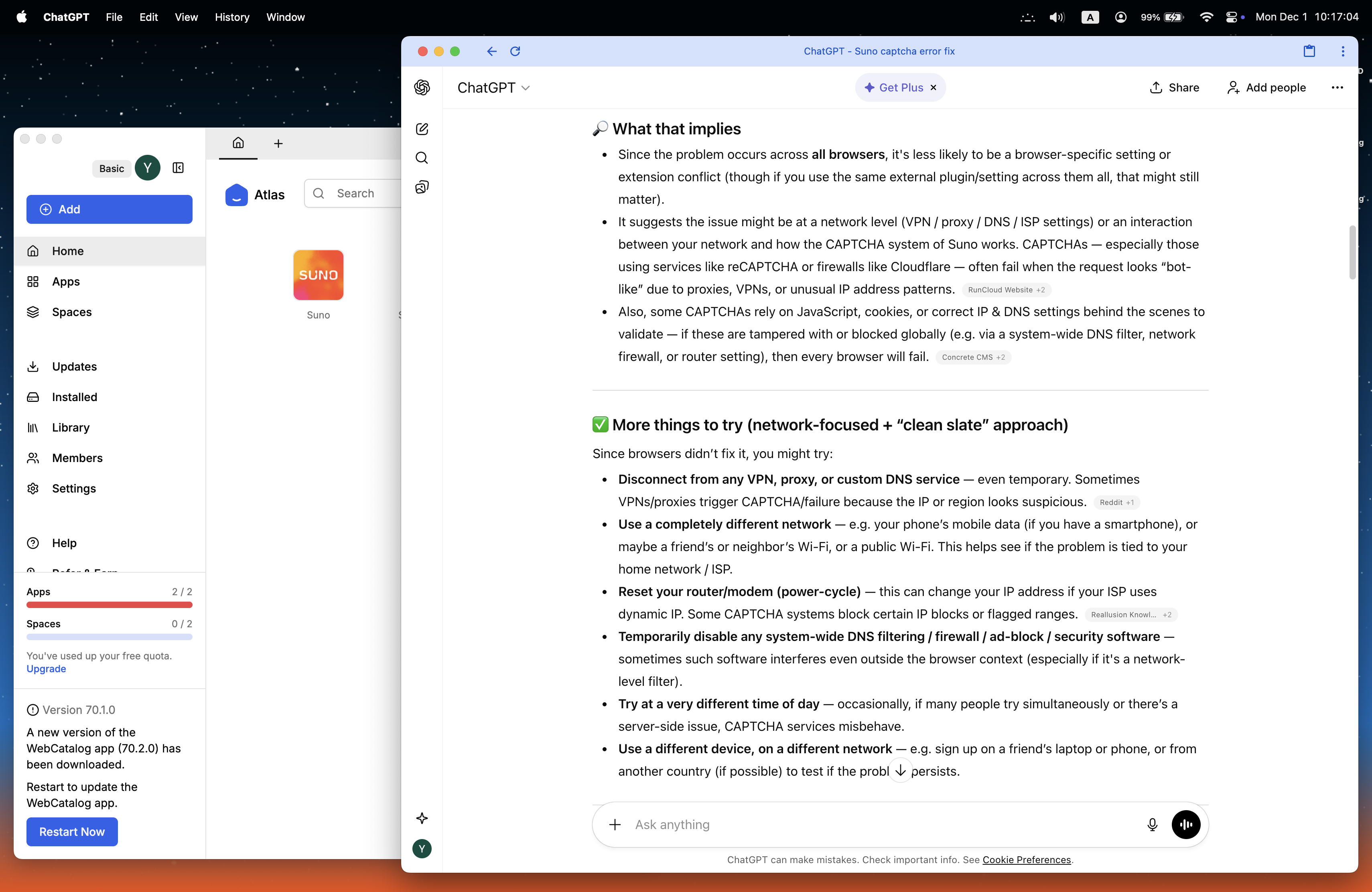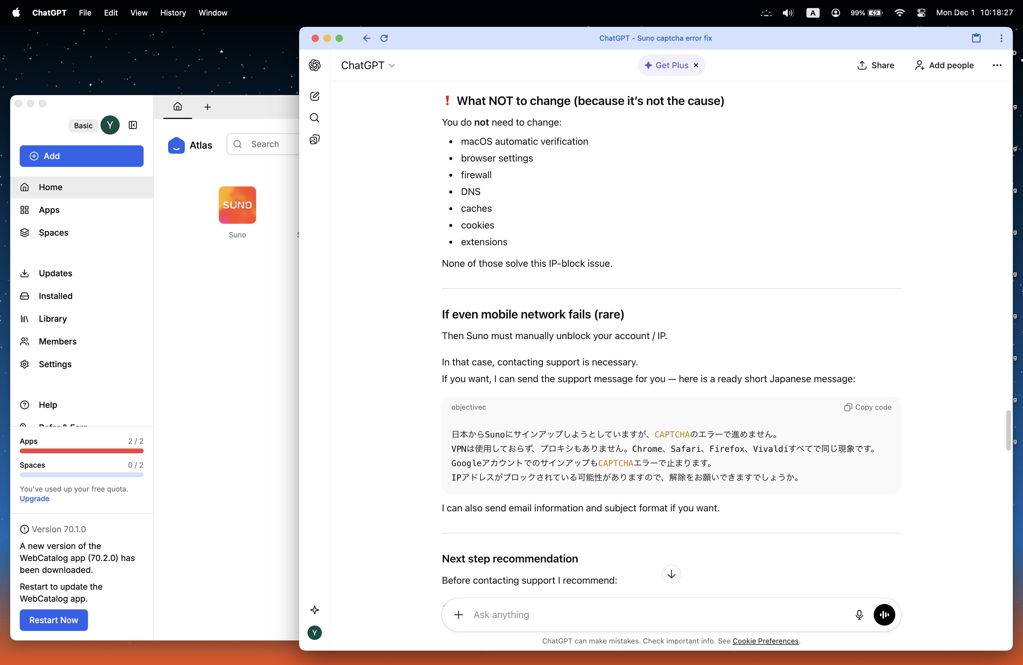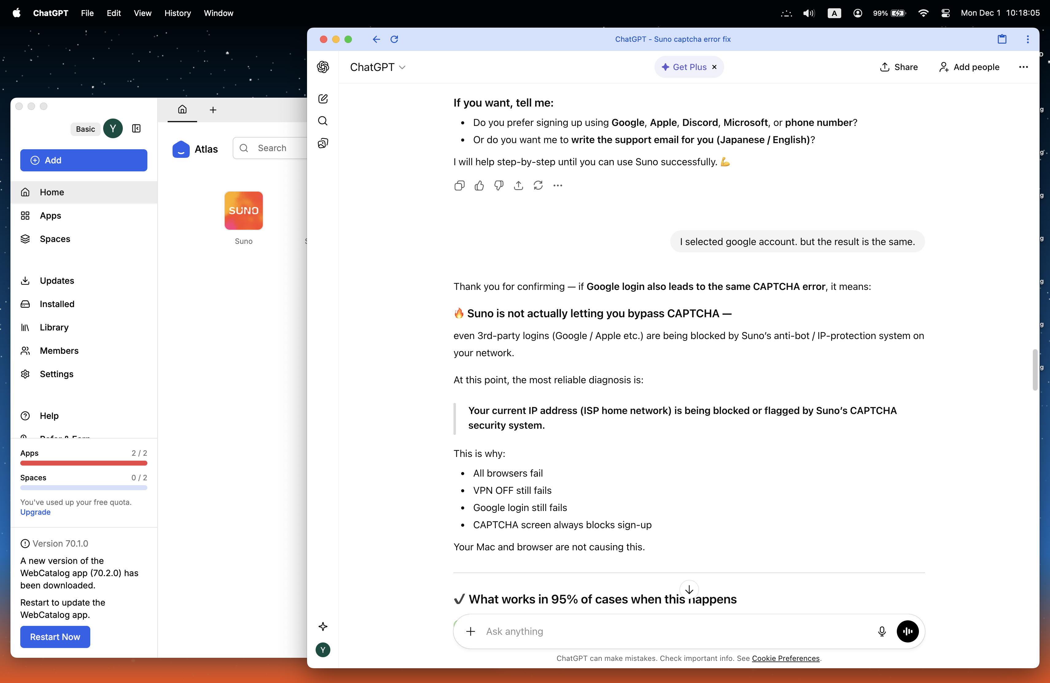 そして、京都精華大の落先生からは来年に向けてある連絡が届いて、いよいよスタートする事になってきた。 その返信で、なんだかsunoがCAPTCHAエラーで困っている・・・と伝えたところ、これまでsunoに連絡した色々な手法を教えてくれたのだが、初めて見る「シークレットウィンドウ(Incognito)で試す」・「Arcの場合」などという情報があったので、Firefoxのプライベートウインドウ、さらに「Arc」という新しいブラウザをインストール、そしてsunoブラウザでのプライベートウインドウ、などを試してみたが、以下のように全て駄目だった。