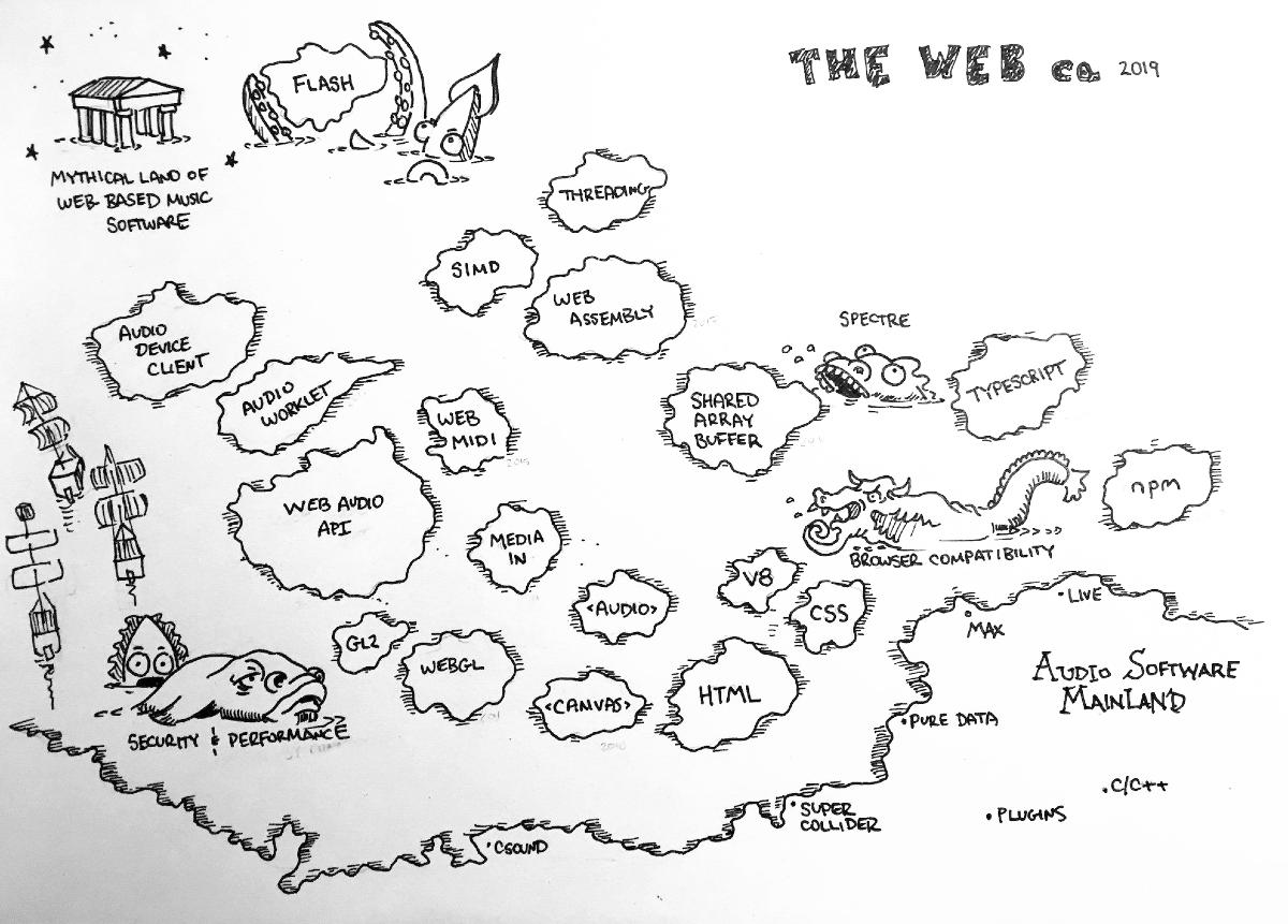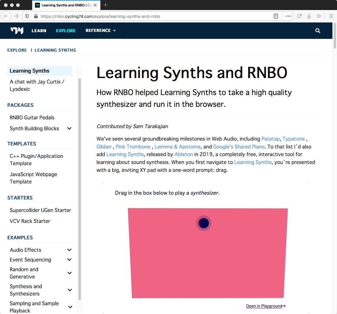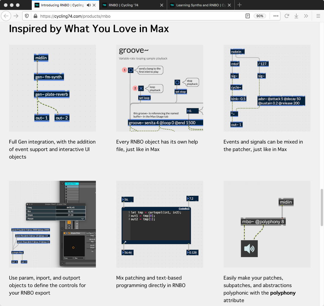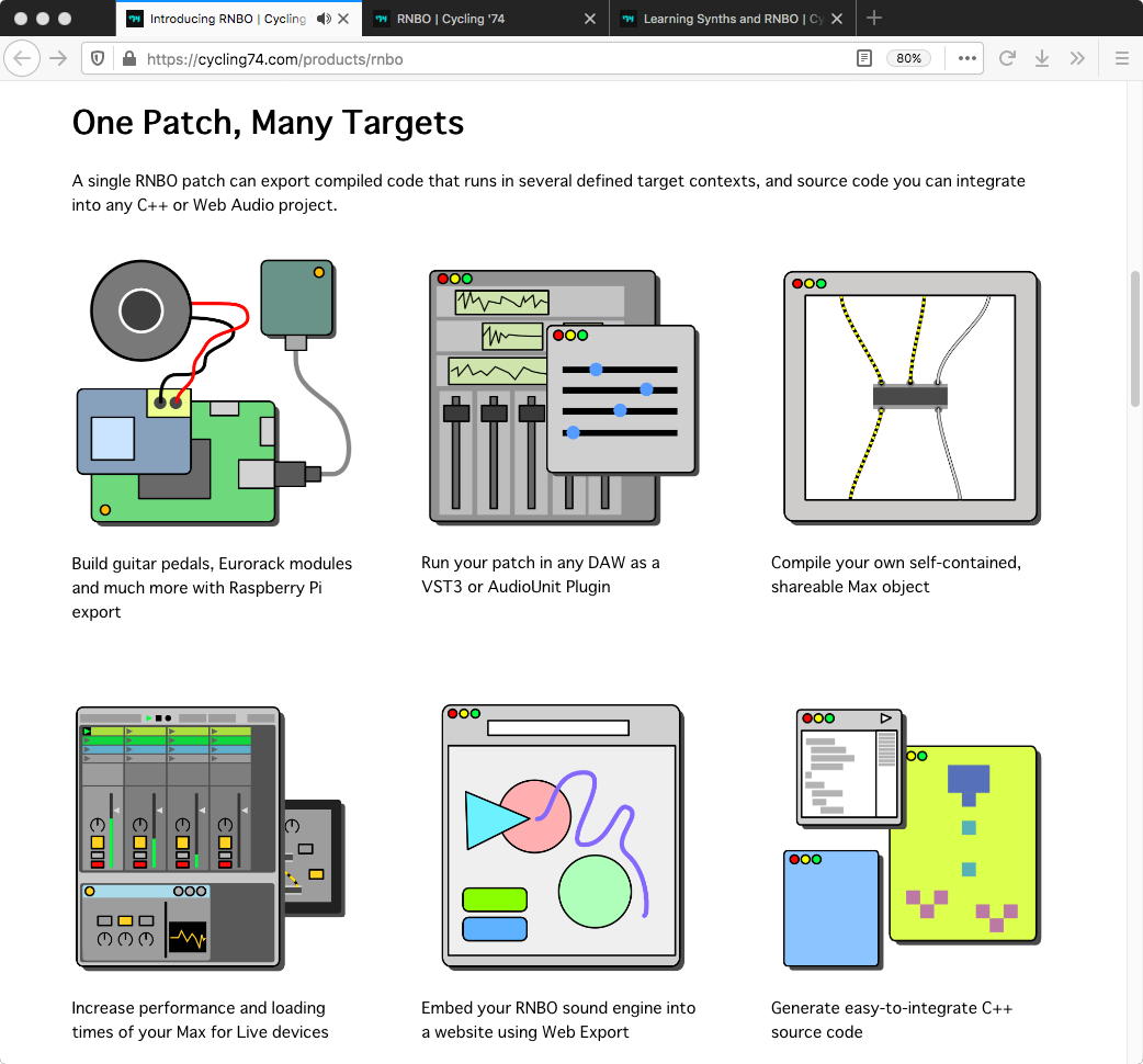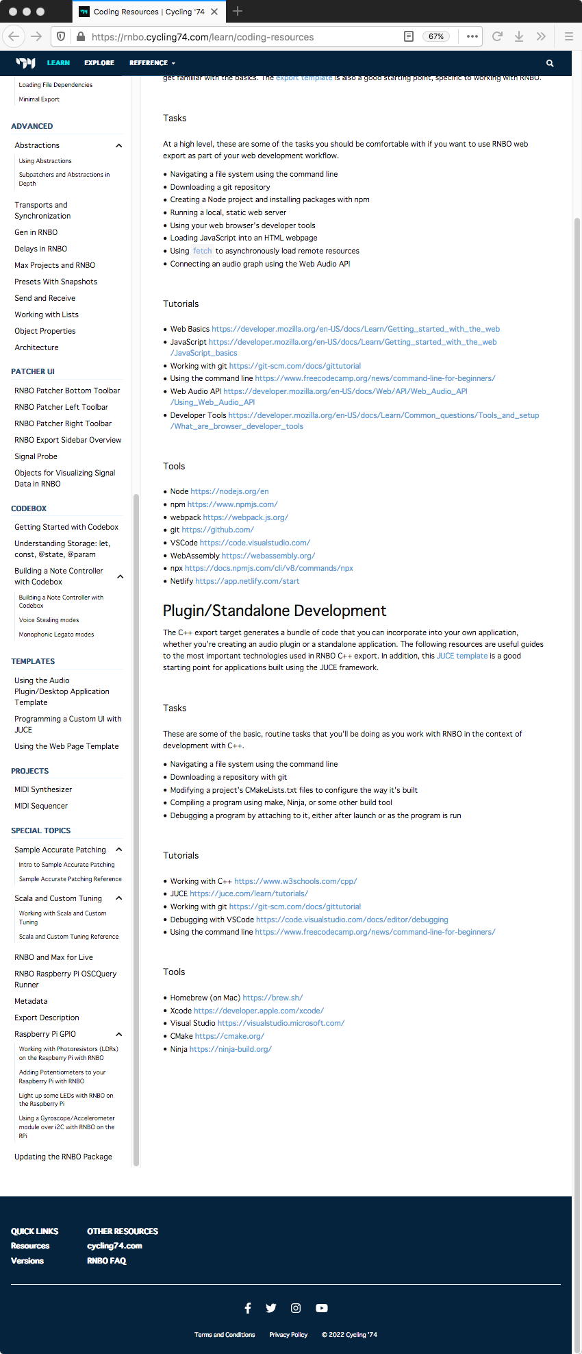 「Export Targets」の中の今回の本命の The Web Export Target を読んでみると、やはりここでの基本は Web Assembly (WASM) と Audio Worklet Node にあると確認できた。 「RNBO In The Browser」には上のように全体の説明があり(by Google翻訳)、さらに続く「Minimum Version」によって、実際に動作するブラウザ環境の要請バージョンも確認できた。 僕のお仕事Mac miniは著しく古いのだが、Firefoxは78.0なので、ギリギリ、はみ出ているものの動いていたのだった。RNBO Web Exportは、ブラウザでパッチを実行するために必要なすべての情報を含む単一の.jsonファイルを生成します。このファイルを使用してブラウザで RNBOパッチを操作するには、別途用意する必要があるコードのコンテキスト内に配置する必要があります。このコードには@rnbo/jsライブラリを含める必要が あります。このライブラリは、エクスポートされた.jsonファイルからRNBOパッチのロジックをWebオーディオノードにラップするために使用されます。 @rnbo/js とエクスポートしたJSONファイルをWebコードに統合する方法は、完全にあなた次第です。つまり、エクスポートされたRNBOパッチを操作するための インターフェースを作成するのは、完全にユーザー次第です。詳しいお勉強をパスしてとりあえず「実験しながら考える」というスタンスであれば、「Web Export ― Quickstart」を見てみると、まずは RNBO Webpage Template からやってみて・・・というのも発見した。 このページはどこかで辿り着いて見ていたような気がするので、どうやら、ここらで準備は出揃ったようだ。