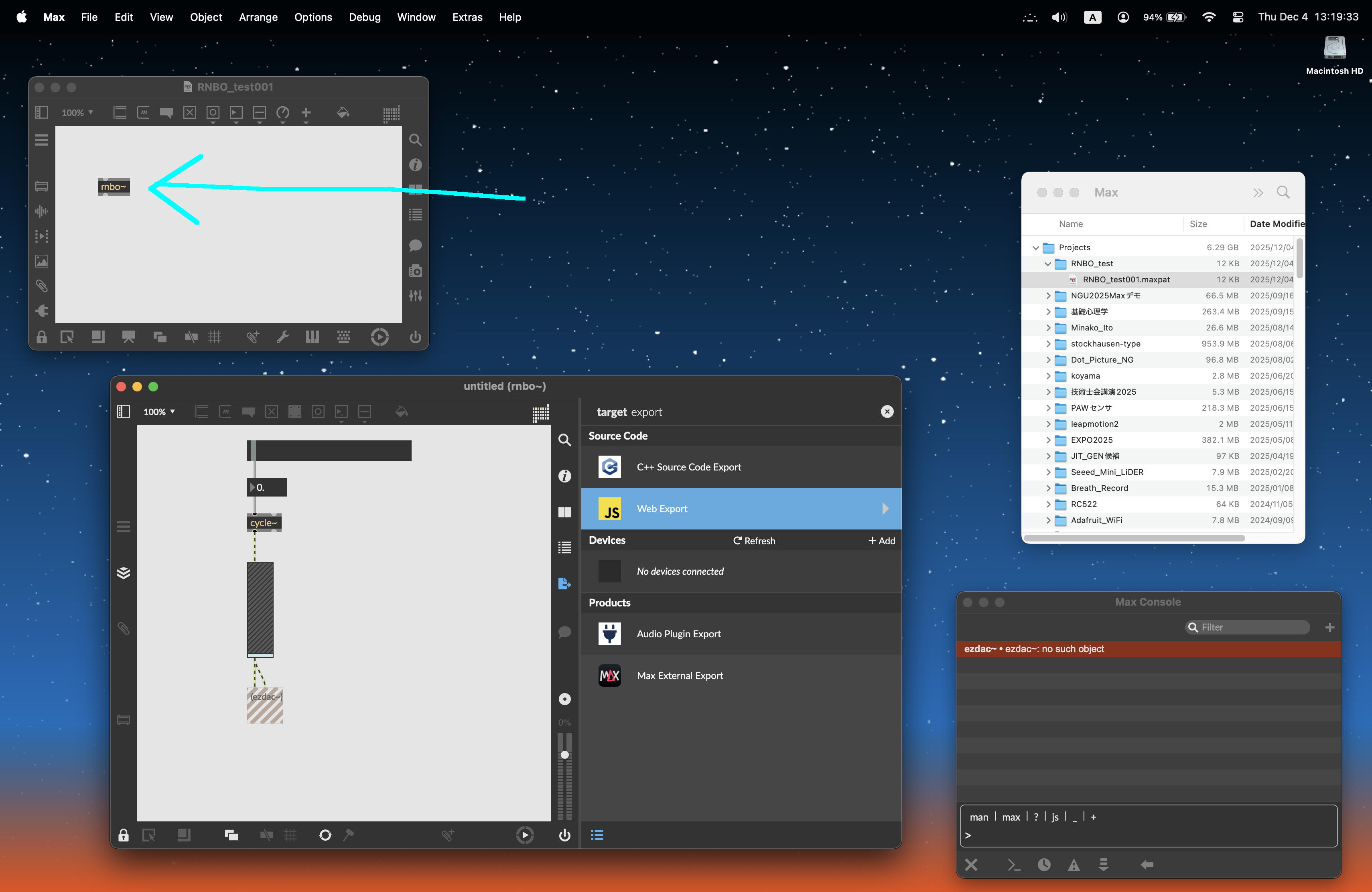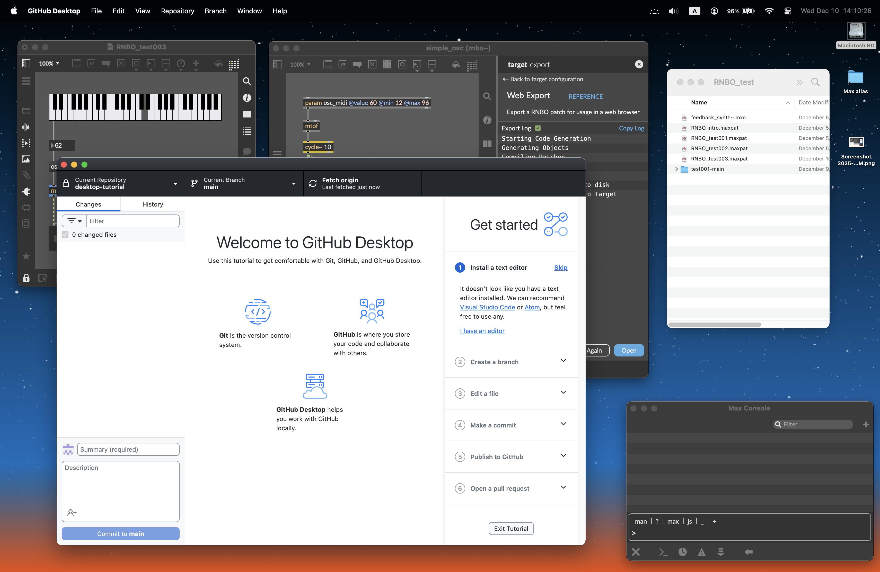 そして午後には再びRNBOの勉強に戻って、ここは基本からと RNBO Audio Input and Output から順になぞった。 シンプルに外部入力からMIDIノートナンバを受けて「cycle~」で鳴らすだけ、という超シンプルなRNBOをexportした。 ただし、ここからがまだ全く分かっていない暗中模索の世界なので、上のようにあれこれ行き来したりGitHubのデスクトップツールなどという謎なものをインストールしたり、RNBO出力のjsonファイルの中身を見たりする事になった。 まぁ、こういうのを続けていると、突然に霧が晴れることもあるので、もう少しジタバタしてみよう。
