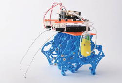 今日は午前に買い物(新・中古車の慣らし運転)に出掛けて、その後はロボプロのリンクロボットのサンプル教材の加工を進めた。 せっかく前回、プレステのリモコンで操縦できるように仕立て上げたのに、2つのレバースイッチによる「ヒゲ」センサを付けて、机の縁まで進むとバックする・・・という仕様にするために、テキスト/教材のArduinoプログラムは単に進むだけ、というものに退化してしまった。