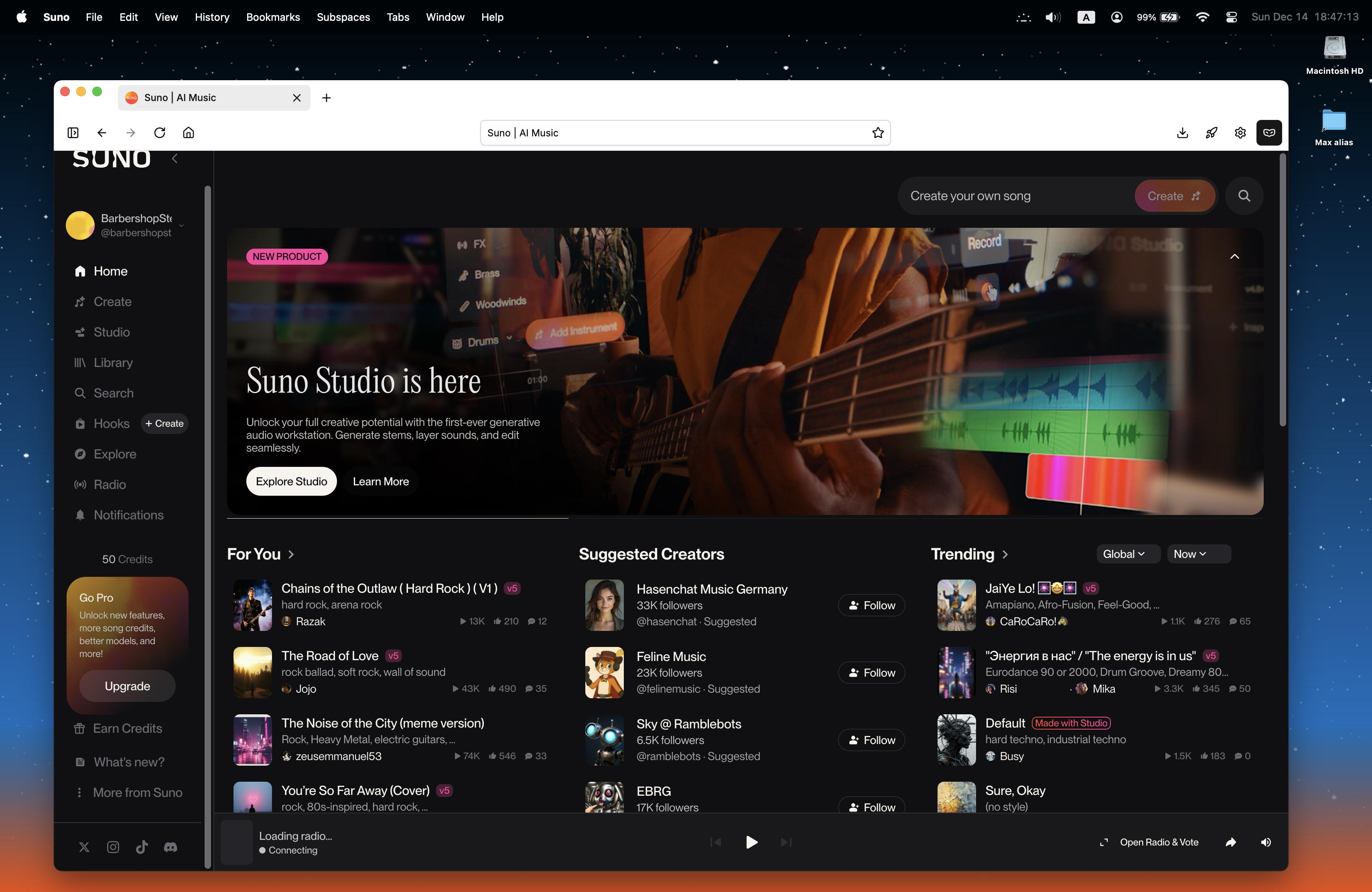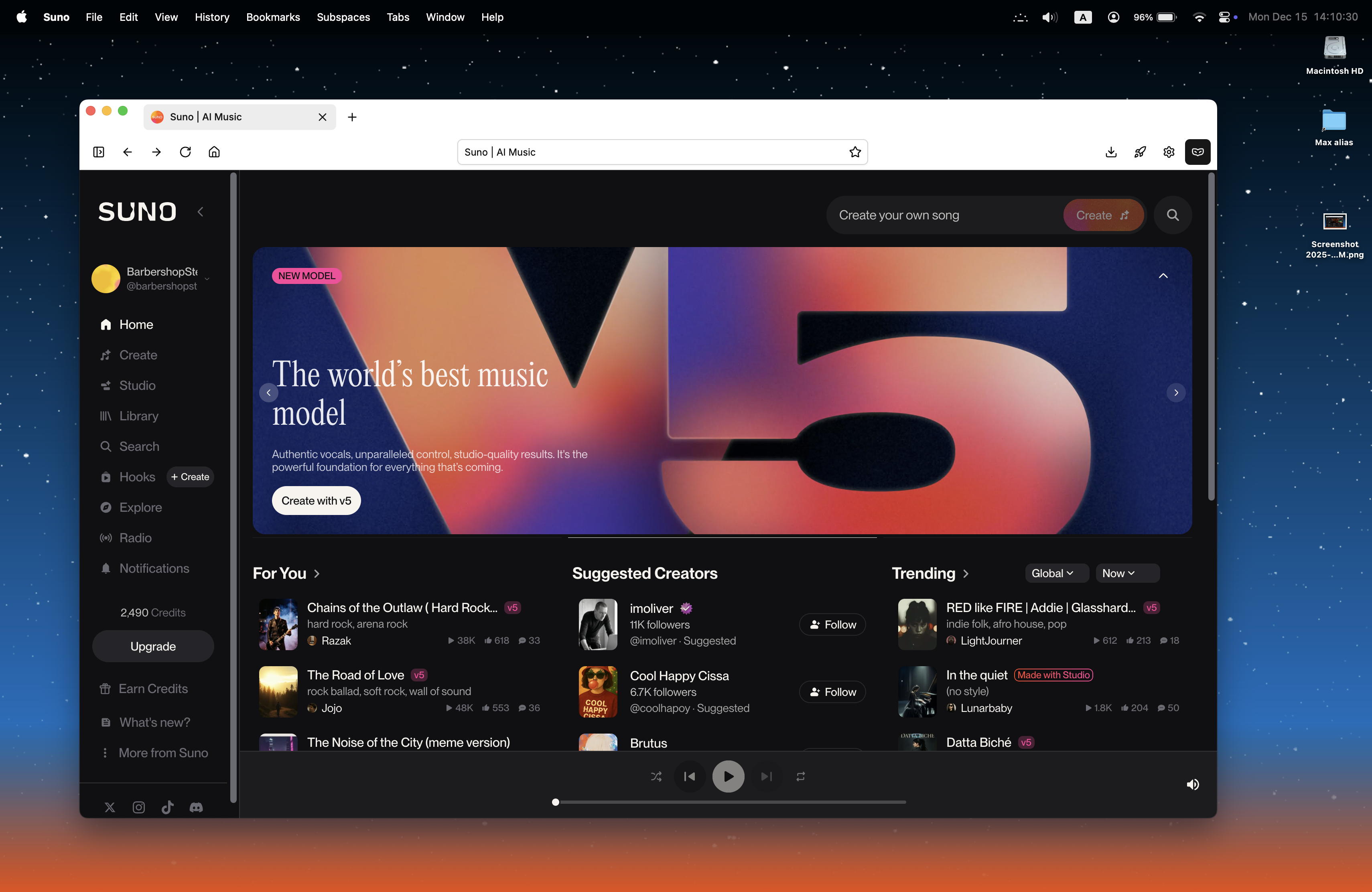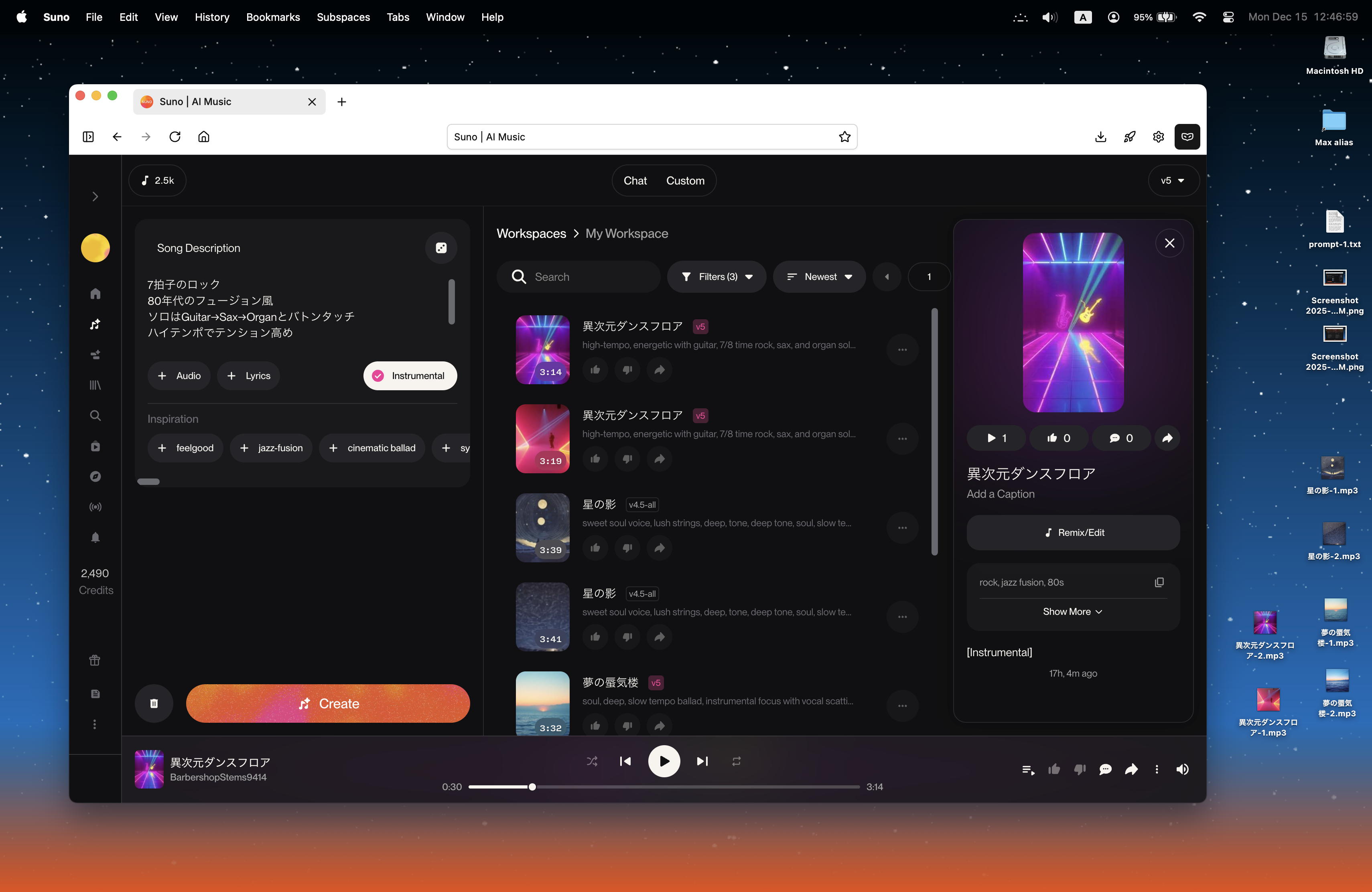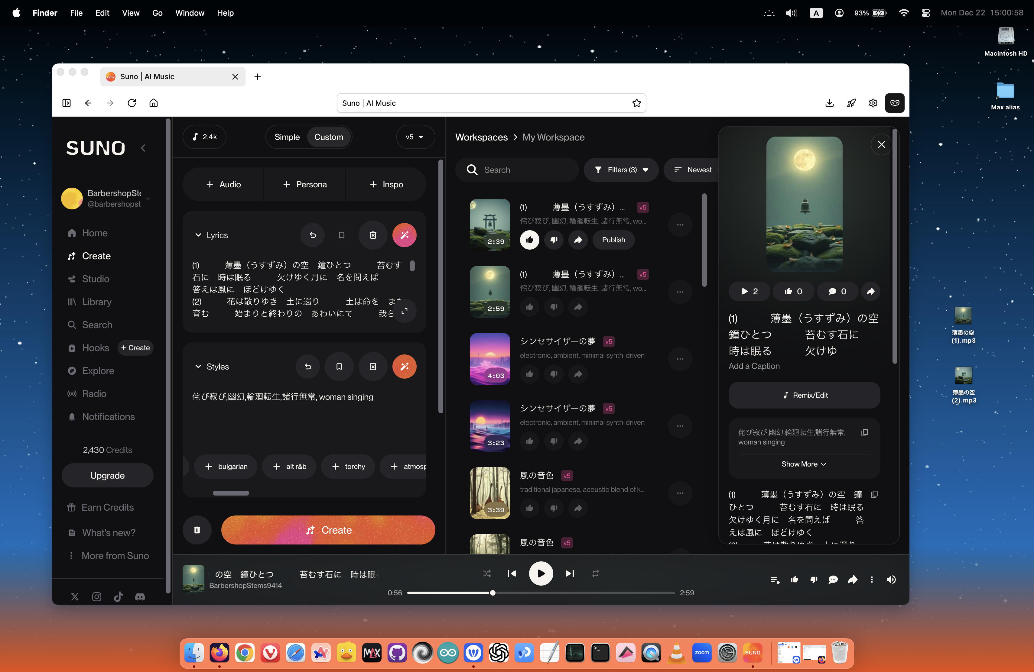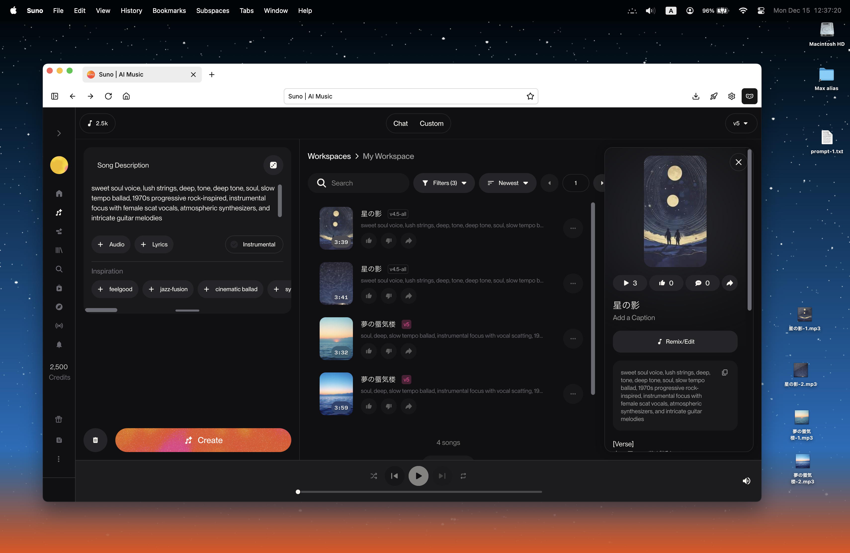 ようやく分かってきたのだが、基本的にsunoの「Create」は「無料」だと、v4.5でフルセットを2曲と、v5で[1分間だけ]の2曲を生成して、その差を見せつけてv5に誘導する模様である。 昨日の最初に4曲あったのは、その時点でまだ「無料」だったためで、サブスク登録して「Pro」になると、低レベルのv4.5というのは生成しなくなるらしい。