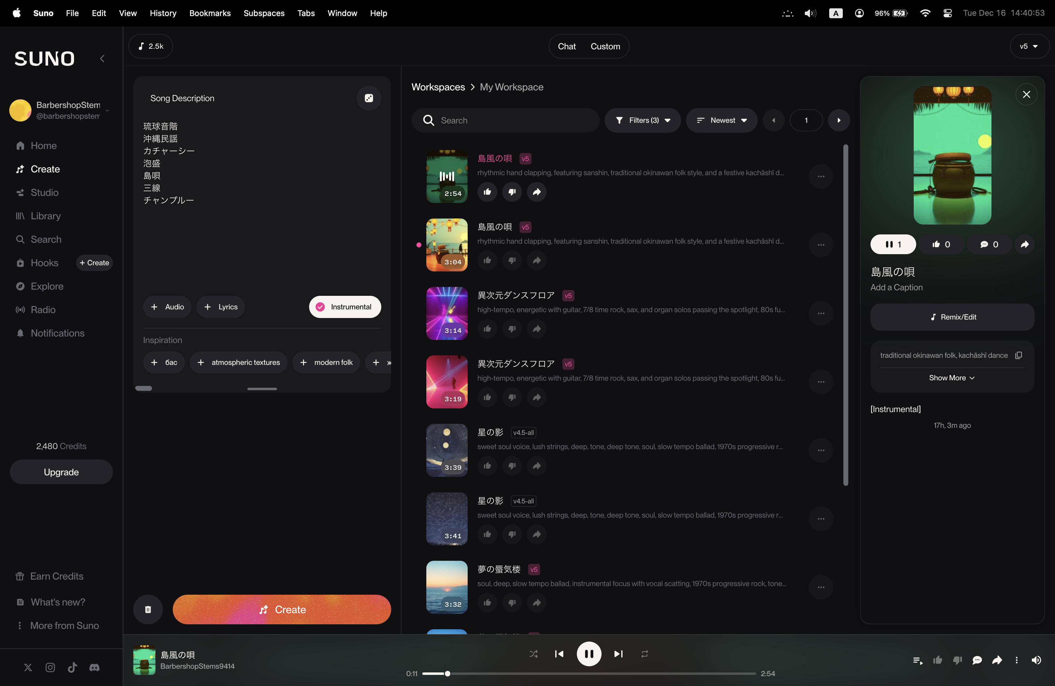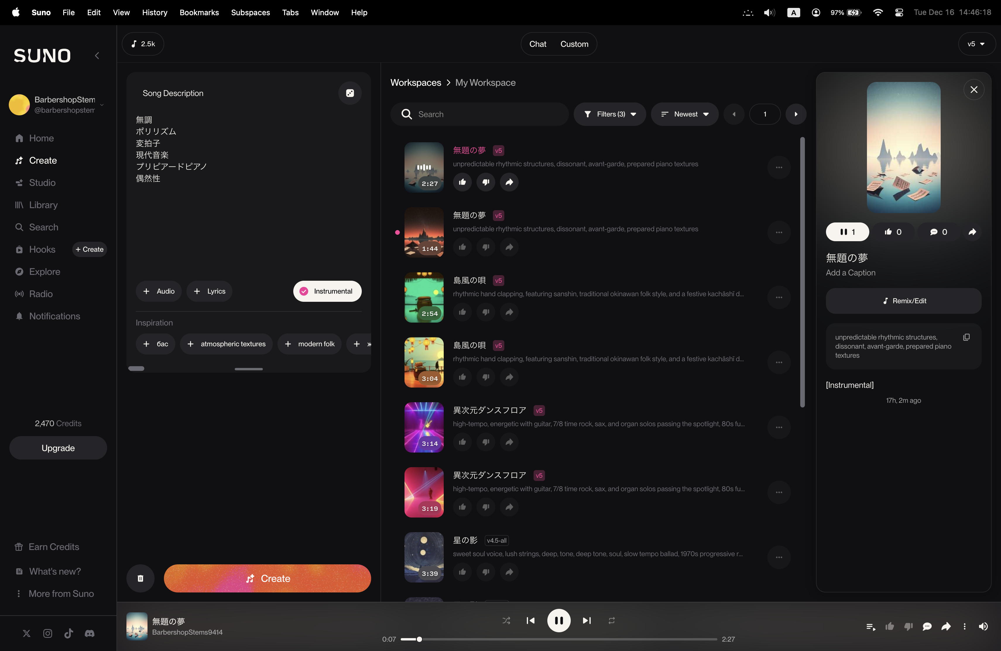 そして、仕方ないので全く同一のPromptのままで、defaultでOFFとなっている「Instruments」のフラグをONにして、ボーカル無しの音楽をさらに2曲、生成させてみた。 sunoが解釈したPromptは「traditional japanese, acoustic blend of koto, with atmospheric textures evoking nature, ethereal, and shamisen, shakuhachi」という事らしく、ボーカル無しとすることで解釈Promptが変わった・・・というのも収穫となった。