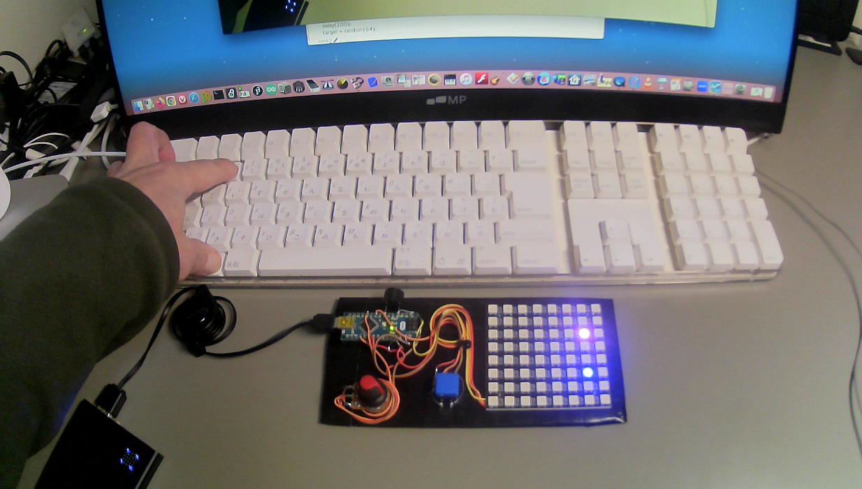 昨日のJoyJoyヒトカラでは5時間で54曲を完走したが、詳しい状況はあまり覚えていないのはいつもの事である。 そして今日の午前中かかって、一昨日にいったん完成していたArduinoシステムのプログラムをけっこう大幅改訂して、当初の構想に近いものを完成できた。 「標的」の白い点に対して、ランダム発色の輝点が動いてスイッチでヒットさせる、という枠組みは同じなのだが、単一の輝点が動くのでなく、数カ所の「残像」を引きずっていく、というのを組み込んだ。 プログラムとしては無駄に冗長だった部分を改訂して、以下の方がかなりスマートである。# include <Adafruit_NeoPixel.h> Adafruit_NeoPixel pixels(64,6,NEO_GRB + NEO_KHZ800); int loop_speed, sw_new, sw_old=1, counter, loop_timer=0, target, conv_rot; int table[98] = {0,9,18,27,36,45,54,63,62,53,44,35,26,17,8,1,10,19,28,37,46,55, 62,61,52,43,34,25,16,9,2,11,20,29,38,47,54,61,60,51,42,33,24,17,10,3,12,21,30, 39,46,53,60,59,50,41,32,25,18,11,4,13,22,31,38,45,52,59,58,49,40,33,26,19,12,5, 14,23,30,37,44,51,58,57,48,41,34,27,20,13,6,15,22,29,36,43,50,57}; int rgb[3], convert[64][4], musicScale[] = {523,587,659,698,784,880,988,1047}; int current, current_old, zanzou[6][4]; // [0=start,1-5][color0-2,point] void setup(){ pixels.begin(); tone(4,880); delay(50); noTone(4); delay(50); tone(4,1760); delay(50); noTone(4); convert_setting(); randomSeed(analogRead(5)); screen_initial(); } void loop(){ loop_speed = map(analogRead(A0), 0, 1023, 1000, 1); if(++loop_timer > loop_speed){ loop_timer = 0; zanzou_display(); sw_scan(); address_calculate(); } sw_scan(); } void zanzou_display(){ int i,j; i = zanzou[5][3]; for(j=0;j<3;j++) pixels.setPixelColor(i, pixels.Color(0,0,0)); for(j=5;j>0;j--){ zanzou[j][3] = zanzou[j-1][3]; for(i=0;i<3;i++){ rgb[i] = 0.53 * zanzou[j-1][i]; zanzou[j][i] = rgb[i]; } pixels.setPixelColor(zanzou[j][3], pixels.Color(rgb[0],rgb[1],rgb[2])); } current_disp(); if(current != target) target_disp(); pixels.show(); } void current_disp(){ color_set(); pixels.setPixelColor(current, pixels.Color(rgb[0],rgb[1],rgb[2])); zanzou[0][3] = current; for(int j=0;j<3;j++) zanzou[0][j] = rgb[j]; } void target_disp(){ for(int j=0;j<3;j++) rgb[j] = 25; pixels.setPixelColor(target, pixels.Color(rgb[0],rgb[1],rgb[2])); } void address_calculate(){ if(++counter > 97){ counter = 0; if(++conv_rot > 3) conv_rot = 0; } current_old = current; current = convert[table[counter]][conv_rot]; } void screen_initial(){ target = random(64); rgb_clear(); target_disp(); pixels.show(); counter = 0; conv_rot = 0; } void sw_scan(){ sw_new = digitalRead(8); if(sw_new != sw_old){ sw_old = sw_new; if(sw_new == 0){ if((current == target) || (current_old == target)){ for(int i=0; i<9; i++){ tone(4, musicScale[i]); delay(40); noTone(4); delay(60); } nice_clear(); screen_initial(); delay(200); } else{ tone(4,500); delay(500); noTone(4); delay(500); } } } } void rgb_clear(){ int i,j; for(i=0;i<64;i++) pixels.setPixelColor(i, pixels.Color(0,0,0)); for(i=0;i<6;i++){ for(j=0;j<4;j++) zanzou[i][j] = 0; } } void color_set(){ switch(random(1,7)){ case 1: rgb[0]=25; rgb[1]=0; rgb[2]=0; break; case 2: rgb[0]=0; rgb[1]=25; rgb[2]=0; break; case 3: rgb[0]=0; rgb[1]=0; rgb[2]=30; break; case 4: rgb[0]=15; rgb[1]=15; rgb[2]=0; break; case 5: rgb[0]=15; rgb[1]=0; rgb[2]=15; break; case 6: rgb[0]=0; rgb[1]=15; rgb[2]=15; break; } } void convert_setting(){ for(int i=0;i<64;i++){ convert[i][0] = i; convert[i][1] = 8*(7-(i%8)) + ((i/8)%8); convert[i][2] = 63-i; convert[i][3] = 8*(i%8) + (7-(i/8)%8); } } void nice_clear(){ int i,j; for(i=0;i<64;i++){ for(j=0;j<3;j++){ rgb[j] = random(1,8); pixels.setPixelColor(i, pixels.Color(rgb[0],rgb[1],rgb[2])); } } pixels.show(); delay(250); for(i=0;i<64;i++){ for(j=0;j<3;j++){ rgb[j] = random(1,20); pixels.setPixelColor(i, pixels.Color(rgb[0],rgb[1],rgb[2])); } } pixels.show(); delay(250); for(i=0;i<64;i++){ for(j=0;j<3;j++){ rgb[j] = random(1,33); pixels.setPixelColor(i, pixels.Color(rgb[0],rgb[1],rgb[2])); } } pixels.show(); delay(250); }