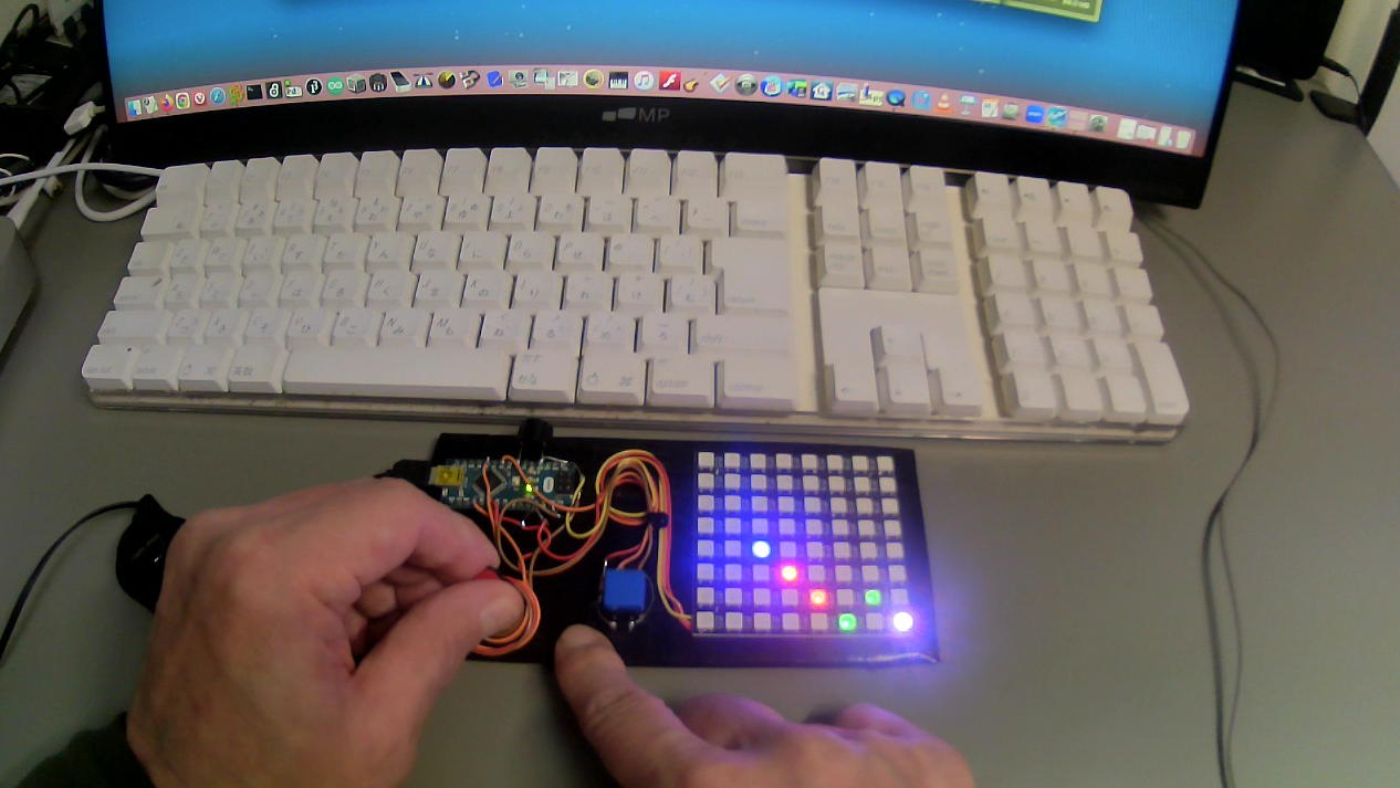 そんな中、 PPAPを「180通りのファンク」でカバーしたら、宇宙の真理に到達した という動画を知って、8時間35分のこの動画(スライドショーでBGM専用)を手元にもゲットしてみた。 これは、要するに、元がファンクなので、金太郎飴のようにどこを取っても、イイのだ。# include <Adafruit_NeoPixel.h> Adafruit_NeoPixel pixels(64,6,NEO_GRB + NEO_KHZ800); int disp, loop_speed, sw_new, sw_old=1, counter=0, loop_timer=0, target, conv_rot=0; int table[98] = {0,9,18,27,36,45,54,63,62,53,44,35,26,17,8,1,10,19,28,37,46,55, 62,61,52,43,34,25,16,9,2,11,20,29,38,47,54,61,60,51,42,33,24,17,10,3,12,21,30, 39,46,53,60,59,50,41,32,25,18,11,4,13,22,31,38,45,52,59,58,49,40,33,26,19,12,5, 14,23,30,37,44,51,58,57,48,41,34,27,20,13,6,15,22,29,36,43,50,57}; int rgb[64][3], convert[64][4], musicScale[] = {523,587,659,698,784,880,988,1047}; void setup(){ pixels.begin(); tone(4,880); delay(50); noTone(4); delay(50); tone(4,1760); delay(50); noTone(4); convert_setting(); randomSeed(analogRead(5)); target = random(64); rgb_clear(); } void loop(){ loop_speed = map(analogRead(A0), 0, 1023, 240, 1); if(++loop_timer > loop_speed){ loop_timer = 0; dot_display(); sw_scan(); } sw_scan(); delay(1); } void sw_scan(){ sw_new = digitalRead(8); if(sw_new != sw_old){ sw_old = sw_new; if(sw_new == 0){ if(disp == target){ rgb_clear(); for(int i=0; i<9; i++){ tone(4, musicScale[i]); delay(40); noTone(4); delay(60); } nice_clear(); counter = 0; conv_rot = 0; delay(200); target = random(64); } else{ tone(4,500); delay(500); noTone(4); delay(500); } } } } void dot_display(){ int i,j; if(++counter > 97){ counter = 0; if(++conv_rot > 3) conv_rot = 0; } j = table[counter]; i = convert[j][conv_rot]; disp = i; rgb_clear(); color_set(i); pixels.setPixelColor(i, pixels.Color(rgb[i][0],rgb[i][1],rgb[i][2])); pixels.show(); } void rgb_clear(){ int i,j; for(i=0;i<64;i++){ for(j=0;j<3;j++){ rgb[i][j] = 0; pixels.setPixelColor(i, pixels.Color(rgb[i][0],rgb[i][1],rgb[i][2])); } } i = target; for(j=0;j<3;j++) rgb[i][j] = 25; pixels.setPixelColor(i, pixels.Color(rgb[i][0],rgb[i][1],rgb[i][2])); pixels.show(); } void color_set(int k){ int i = k; int dice = random(1,7); switch(dice){ case 1: rgb[i][0]=25; rgb[i][1]=0; rgb[i][2]=0; break; case 2: rgb[i][0]=0; rgb[i][1]=25; rgb[i][2]=0; break; case 3: rgb[i][0]=0; rgb[i][1]=0; rgb[i][2]=25; break; case 4: rgb[i][0]=15; rgb[i][1]=15; rgb[i][2]=0; break; case 5: rgb[i][0]=15; rgb[i][1]=0; rgb[i][2]=15; break; case 6: rgb[i][0]=0; rgb[i][1]=15; rgb[i][2]=15; break; } } void convert_setting(){ for(int i=0;i<64;i++){ convert[i][0] = i; convert[i][1] = 8*(7-(i%8)) + ((i/8)%8); convert[i][2] = 63-i; convert[i][3] = 8*(i%8) + (7-(i/8)%8); } } void nice_clear(){ int i,j; for(i=0;i<64;i++){ for(j=0;j<3;j++){ rgb[i][j] = random(1,9); pixels.setPixelColor(i, pixels.Color(rgb[i][0],rgb[i][1],rgb[i][2])); } } pixels.show(); delay(250); for(i=0;i<64;i++){ for(j=0;j<3;j++){ rgb[i][j] = random(1,18); pixels.setPixelColor(i, pixels.Color(rgb[i][0],rgb[i][1],rgb[i][2])); } } pixels.show(); delay(250); for(i=0;i<64;i++){ for(j=0;j<3;j++){ rgb[i][j] = random(1,27); pixels.setPixelColor(i, pixels.Color(rgb[i][0],rgb[i][1],rgb[i][2])); } } pixels.show(); delay(250); for(i=0;i<64;i++){ for(j=0;j<3;j++){ rgb[i][j] = 0; pixels.setPixelColor(i, pixels.Color(rgb[i][0],rgb[i][1],rgb[i][2])); } } pixels.show(); }