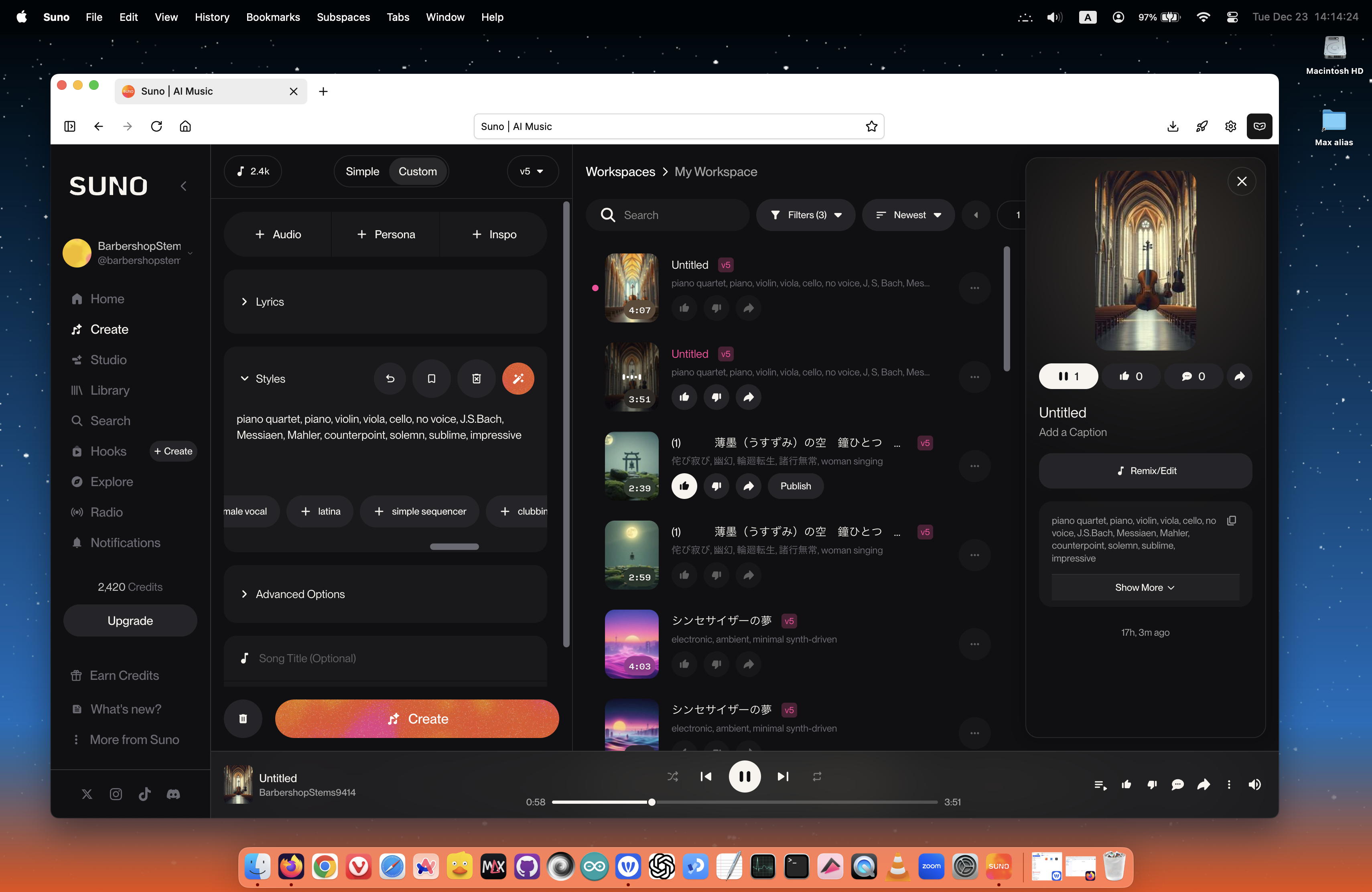 勝手にタイトルや歌詞を作ってボーカルを入れるsunoの素性が分かってきたので、今回は一転して「piano quartet」・「piano」・「violin」・「viola」・「cello」・「no voice」・「J. S. Bach」・「Messiaen」・「Mahler」・「counterpoint」・「solemn」・「sublime」・「impressive」としてみた(Promptに日本語を使うことでの齟齬も避けている)。 そして「counterpoint」(対位法)と書けば流石にBACH風になるだろう、と思いつつも、メシアンとマーラーを加えて、やや混乱を誘ったつもりである。