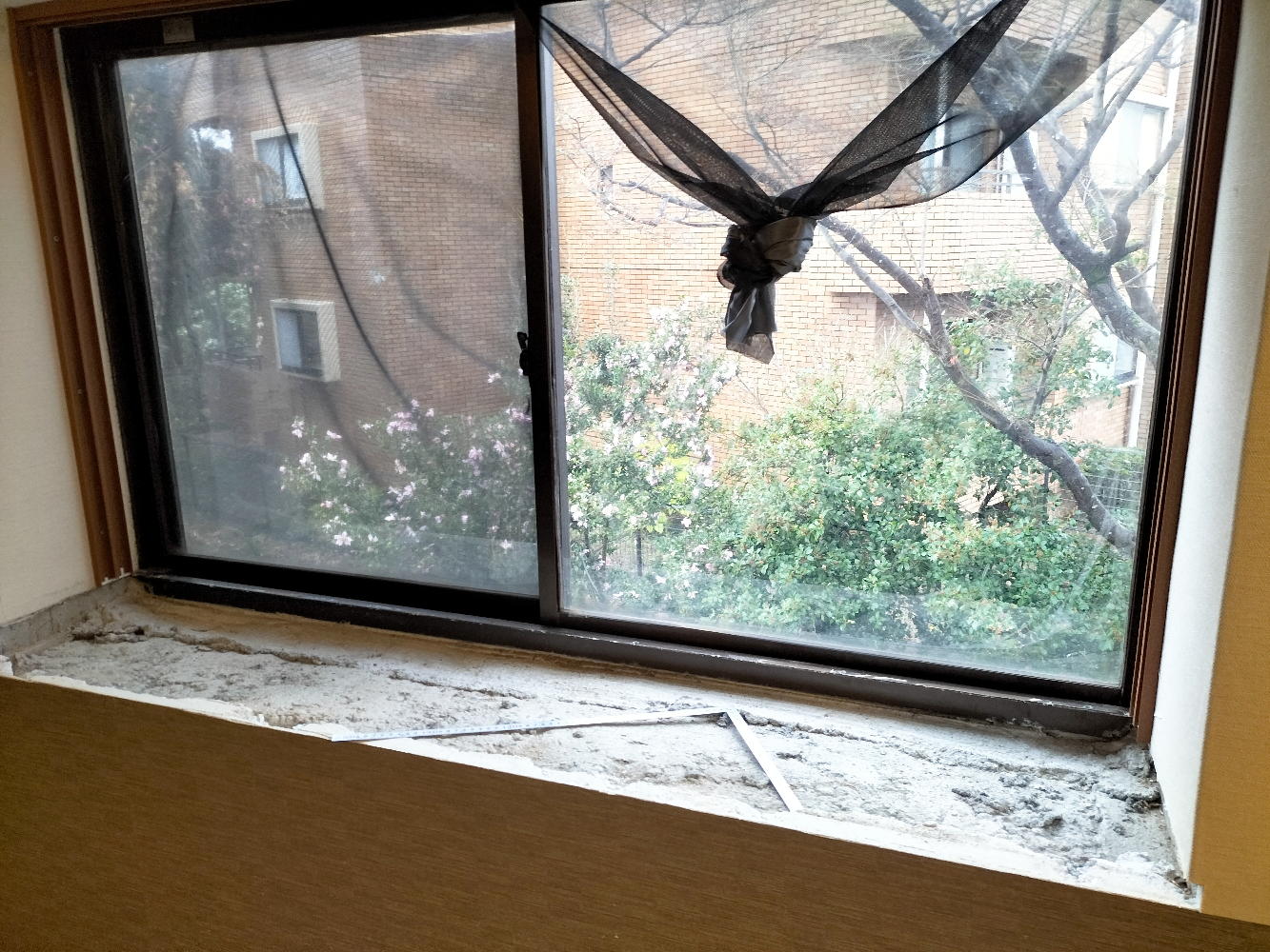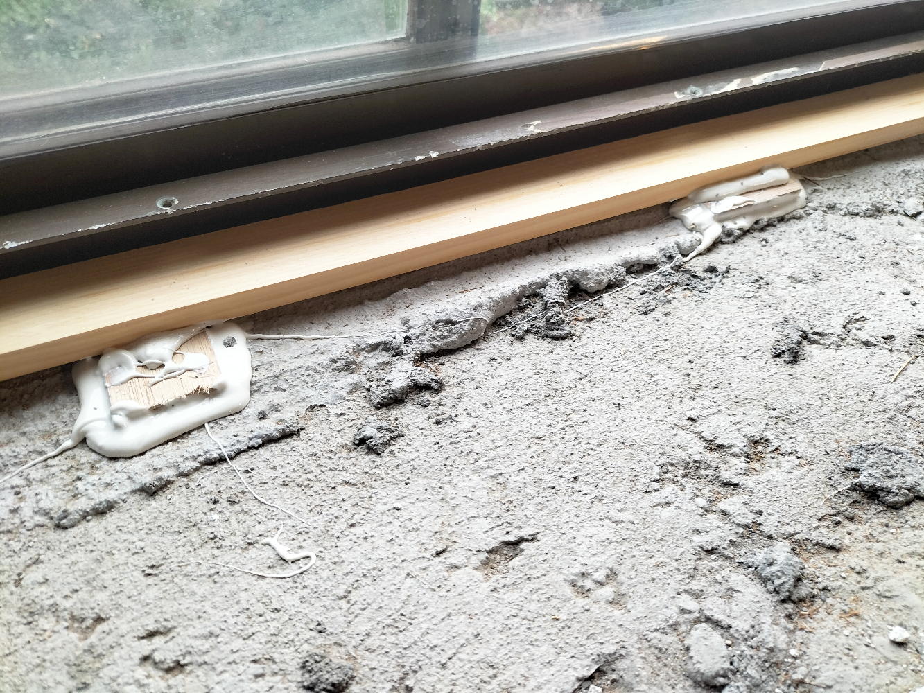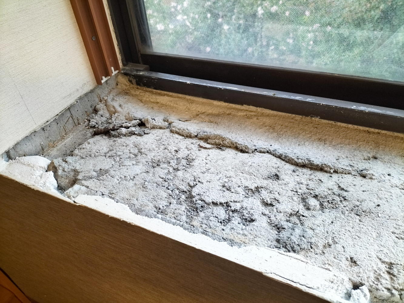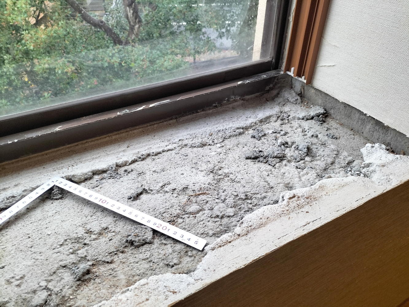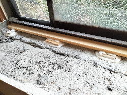 そしてお昼休みで大工さんが一旦帰ると、窓際は上のようになっていた。 これぞ日本のお家芸、「現物合わせ」の極致のプロ版である。 簡単な仕事ではなく、採寸して細工した木片が高さを精密に揃えて、全体として精密に水平を出しての調整であり、この全体を包んで支える接着剤は僕も活用してきたエポキシ系だろう。 アサヒハウス工業の手抜きの穴埋めをするのは、この接着剤による現物合わせなのだ。
