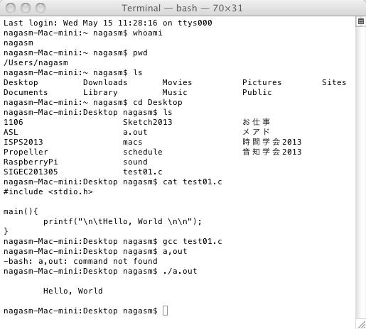 ■MacOSXのターミナルでUnixする■ ・ターミナルを起動する → 「/Users/nagasm」がdefault 適当にDesktopなどにcdする ・ソースファイルはJeditで書き出す。拡張子は「*.c」 ・コンパイルは「gcc ****.c」でOK → defaultの出力実行プログラムは「a.out」 実行は「./」に続けてプログラムを指定する 以下は出来た(^_^) #include <stdio.h> main(){ printf("\n\tHello, World \n\n"); } ・その実行は「./a.out」でOK ・バックスラッシュの入力は「option+"?"」 ・manから抜けるのは「control+"z"」