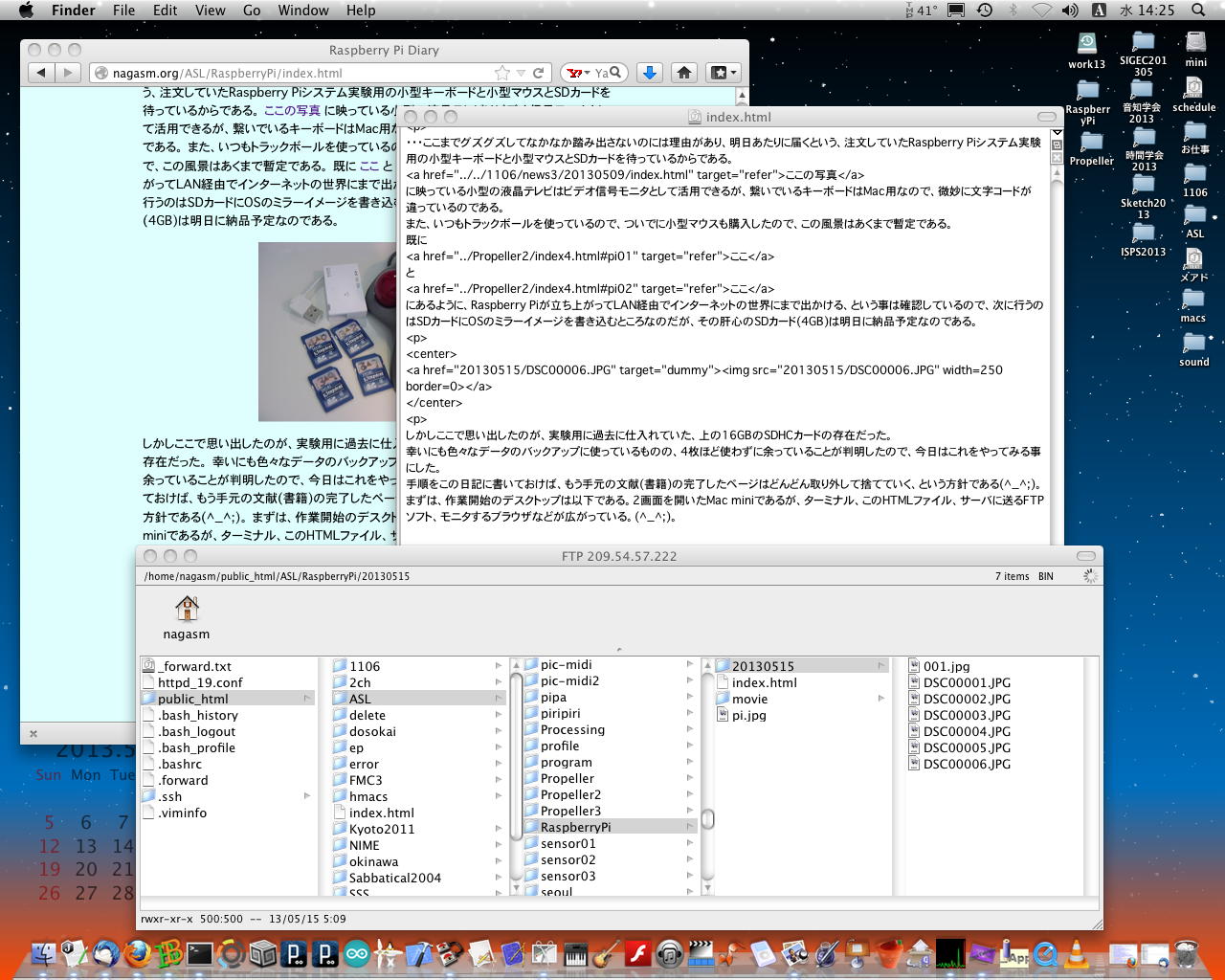しかしここで思い出したのが、実験用に過去に仕入れていた、上の16GBのSDHCカードの存在だった。 幸いにも色々なデータのバックアップに使っているものの、4枚ほど使わずに余っていることが判明したので、今日はこれをやってみる事にした。 手順をこの日記に書いておけば、もう手元の文献(書籍)の完了したページはどんどん取り外して捨てていく、という方針である(^_^;)。 まずは、作業開始のデスクトップは以下である。2画面を開いたMac miniであるが、ターミナル、このHTMLファイル、サーバに送るFTPソフト、モニタするブラウザなどが広がっている。(^_^;)。