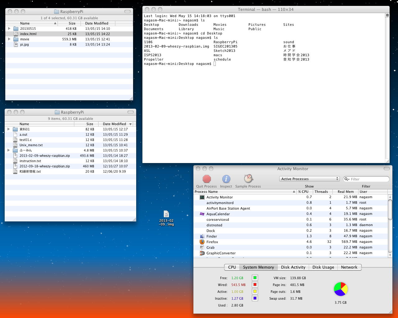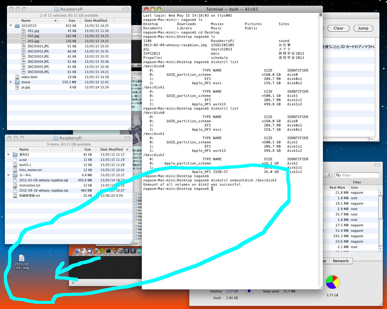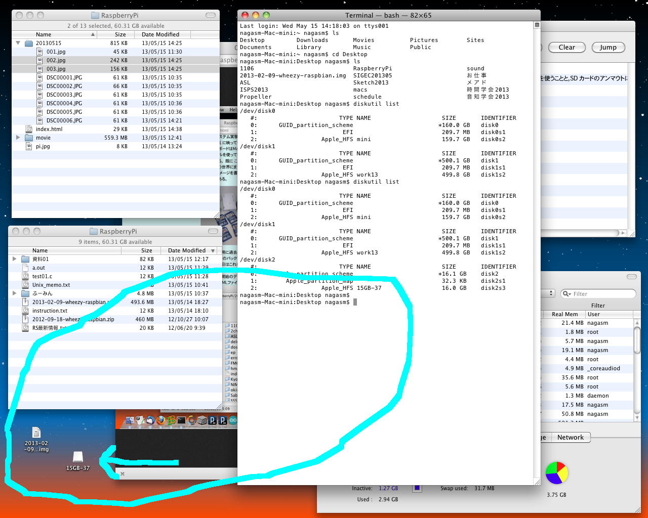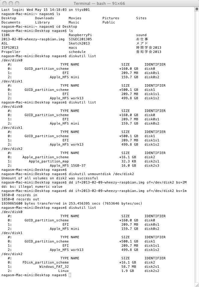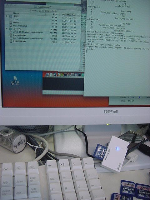 そしてここでSDカードリーダにSDカードを挿して再び「diskutil list」とすると以下のようにディスクの一覧が変化した。nagasm-Mac-mini:Desktop nagasm$ diskutil list /dev/disk0 #: TYPE NAME SIZE IDENTIFIER 0: GUID_partition_scheme *160.0 GB disk0 1: EFI 209.7 MB disk0s1 2: Apple_HFS mini 159.7 GB disk0s2 /dev/disk1 #: TYPE NAME SIZE IDENTIFIER 0: GUID_partition_scheme *500.1 GB disk1 1: EFI 209.7 MB disk1s1 2: Apple_HFS work13 499.8 GB disk1s2明らかに、新たに登場した「/dev/disk2」が、容量からもSDカードである。 このドライブを間違うと、HDDを消去してしまうので、ここは注意が必要なのである。 この状態ではOSがSDカードをドライブとしてマウントしているので、まずマウントを解除する必要がある。 ターミナルから「diskutil unmountdisk /dev/disk2」と打つと、「Unmount of all volumes on disk2 was successful」と表示されて、以下のようにアイコンがデスクトップから消えた。nagasm-Mac-mini:Desktop nagasm$ diskutil list /dev/disk0 #: TYPE NAME SIZE IDENTIFIER 0: GUID_partition_scheme *160.0 GB disk0 1: EFI 209.7 MB disk0s1 2: Apple_HFS mini 159.7 GB disk0s2 /dev/disk1 #: TYPE NAME SIZE IDENTIFIER 0: GUID_partition_scheme *500.1 GB disk1 1: EFI 209.7 MB disk1s1 2: Apple_HFS work13 499.8 GB disk1s2 /dev/disk2 #: TYPE NAME SIZE IDENTIFIER 0: Apple_partition_scheme *16.1 GB disk2 1: Apple_partition_map 32.3 KB disk2s1 2: Apple_HFS 15GB-37 16.0 GB disk2s3