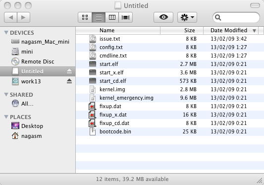 SDカードに書き込む方法は、文献ではLinuxとかWindowsとかも書かれているが、ここはMacOSXだけで十分である。 ユーティリティの「ターミナル」アプリケー ションをまず起動して、「diskutil list」とすると以下のようにディスクの一覧が出た。 これは内蔵HDD(160GB)と、外付けのTime Machine用500GBである。