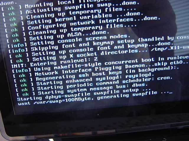 そして、せっかくなので以下同文の繰り返しで、SDカードを計4枚、Raspberry Pi用に書き換えた。 次のSDカードを入れて、ドライブのアイコンと「/dev/disk2」を確認してアンマウントしようとしたらエラーになったが、これはFTPソフトが掴んでいるためであり、FTPソフトを一旦quitすると問題なく作業できた。 そして、いよいよ手元にあったRaspberry Piに入っていた、OS入りとして1枚だけ購入していたSDカードを、この新しいSDカードに差し替えて、まずは立ち上げてみた。 すると以下のように、何故か「generating swapfile ...」というメッセージとともに、長い長い沈黙に入った(^_^;)。