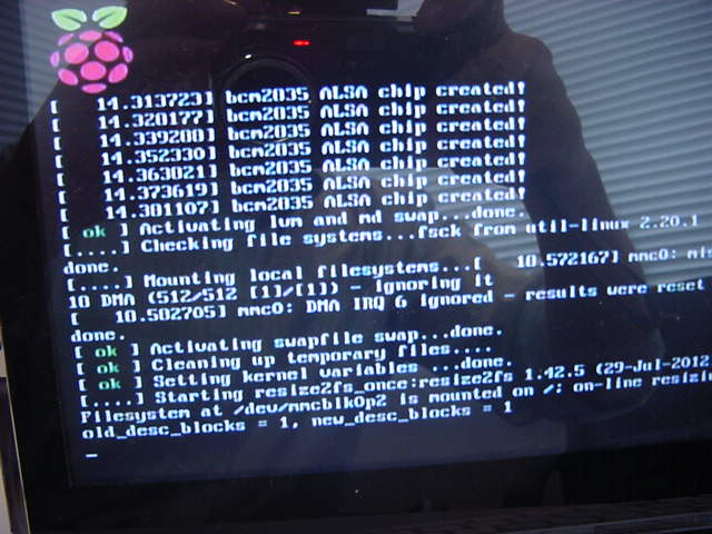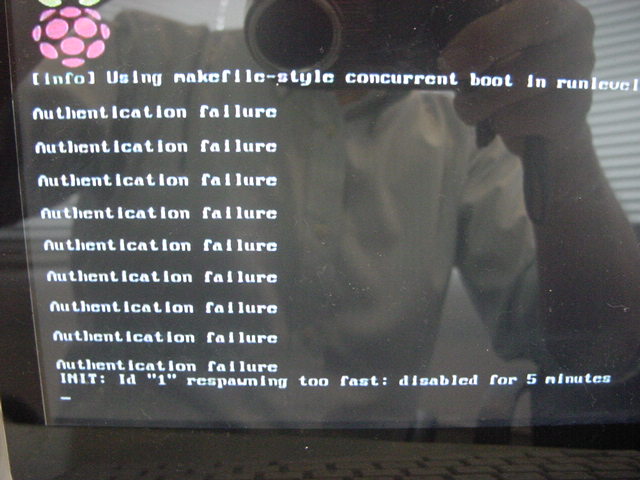 とりあえずRaspberry Piの電源を抜き、再び立ち上げてみると、今度はさっきと違うところで止まったままになり、しばらくして表示が進んではまた止まり、と不思議な挙動を繰り返していて、20分たってもログイン画面まで到達しない。 うーーむ、なかなかRaspberry Piは厄介だぞ。