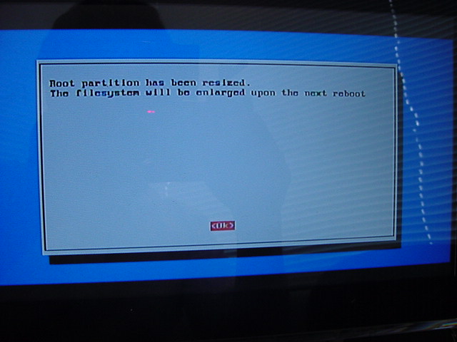 そしてこのまま10分以上、何も変わらないのを確認して、Raspberry Piから電源プラグを抜き、数秒してから、再度リブートした。 電源スイッチがないので、立ち上げ直すにはこれしかない。 すると今度は、以下のような表示が出て、5分間、待つのだという(^_^;)。なんだこりゃ。