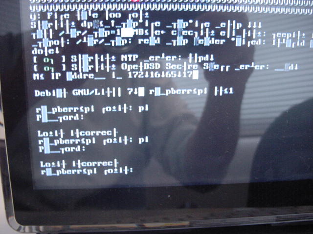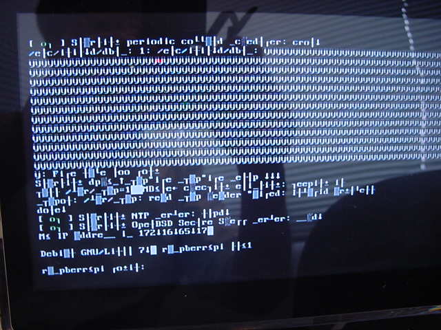 ・・・しかし今度は、上の再起動で行う領域拡張のメッセージが、15分以上したところで画面から消えて真っ暗になってまたまたドキッとしたが、これはスクリーンセーバであって、キーボードのエンターキーで現れてくれた。 5分以上経過して、37番のSDカードのイメージ書き込みが終わっても、まだまだSDカードのリサイズは終わらない。 なかなかに不安な時間が経過した後に、以下のように今度は文字化けの画面となった。 キーボードのロケールをしていなかったからか(^_^;)、「pi」でのログインも出来ない。