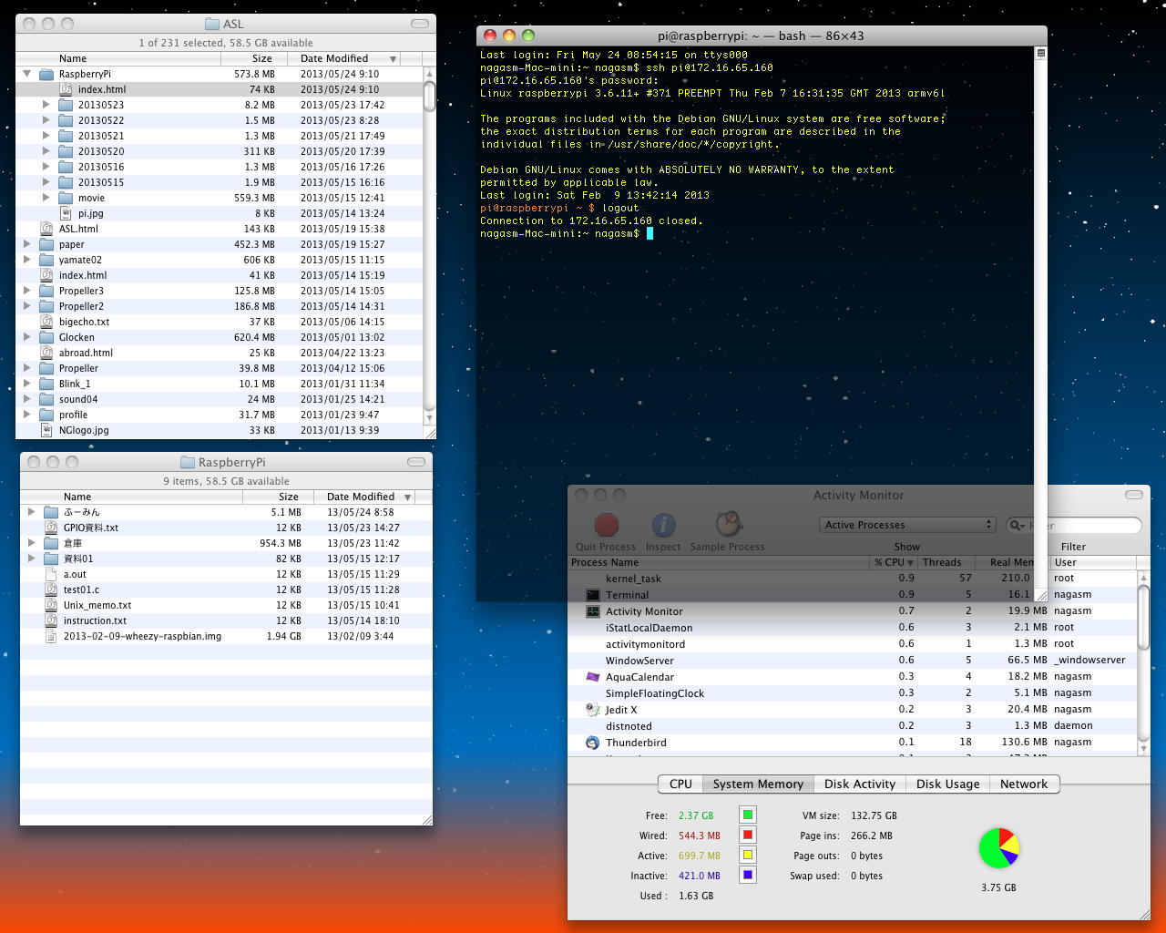 そしてふーみんからも以下のメイルが届いた。 確かに、昨日、うまくいったと確認してMacをシャットダウンする時に、起動したつもりの無かった「X11」というのがターミナルと別に立ち上がっていて、ヘンだと思ったのだった。このたびは、UQ WiMAXにお申し込みいただき誠にありがとうございます。 新規お申し込みの手続きが完了いたしましたので、ご連絡いたします。 お申し込みいただきました内容は以下のとおりです。 【お申込内容】 新規ご契約 【受付番号】 K027170### 【契約者ID】 C100278### 【料金契約番号】 U100640### 【料金プラン】 UQ 1 Day 【WiMAX搭載機器名】 AtermWM3800R白 × 1台 【WiMAX搭載機器名】 AtermWM3800R専用 クレードル × 1台 お申込内容の詳細は、弊社ホームページの「My UQ」よりご確認ください。 <パソコンからは> http://www.uqwimax.jp/service/support/myuq.html ご利用の際には、お客様が設定されたMy UQ IDとパスワードが必要です。 ※My UQを初めてご利用になるお客様のMy UQ IDとパスワードは、以下の番号 となります。 My UQ ID :上記の受付番号(半角英数字10桁) パスワード:お申し込み手続き時に入力された「暗証番号」 (半角数字4桁) ■UQ 1 Day(1日利用プラン)のご利用について UQ 1 Dayをご契約のお客様は「ご利用時間」をご購入いただく必要がござい ます。詳しくは下記URLをご参照ください。 http://www.uqwimax.jp/service/price/price2.html UQ 1 Dayは、ご契約いただいた時点で「ご利用時間かんたん購入」が 有効になっています。最後にご利用された日の翌日から90日間は My UQ ID/パスワードの入力をしなくてもWiMAX接続後ブラウザー を起動するだけでご登録いただいたクレジットカードを 用いたご利用時間のご購入、および月額契約への変更が可能です。 ご利用にあたっては以下の点をご確認ください。 ・意図せずWiMAX搭載機器を第三者に利用されてしまった場合、 これらの手続きに伴う料金が発生する可能性があります。 WiMAX搭載機器を盗難・紛失された際は、UQお客様サポートセンターに 早急にご連絡いただけますようお願いします。 ※「ご利用時間かんたん購入」を利用しない場合、My UQから 無効にすることができます。無効にした場合は、ご利用時間のご購入、 および月額契約への変更にあたって、手続きごとにMy UQ ID/パスワード によるログインが必要となります。 こちらは自動配信メールのため、当メールアドレスへの返信はできません。 今後ともUQ WiMAXをご愛顧いただきますよう、よろしくお願いいたします。そこで、ゼミで学生に見せるために研究室中央のデスクに移動させていたRaspberry Piを再び元の場所に戻して、起動したところDHCPサーバから取得したIPアドレスが「172.16.65.154」と新しくなったのを確認して、再び、Macのターミナルから以下のようにやってみると、なんとssh出来てしまった。うーん・・・ > 最初だけ「-X」が必要のようです。 この「-X」は X11の転送を許可する、というオプションなんですよね。 なんでこんなもんが関係するのか、すごくpuzzlingです^^;