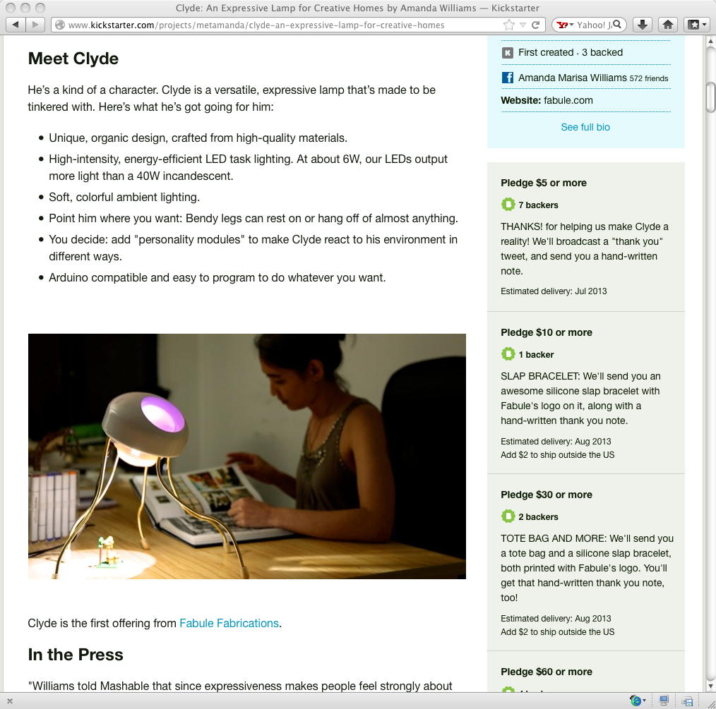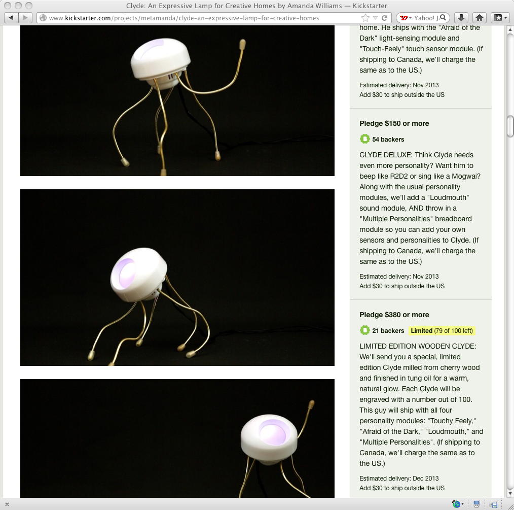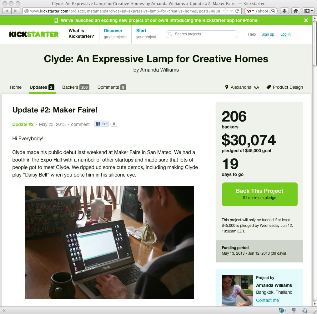 さて、朝イチで昨日からのニュースなどを読んでいると、立て続けにトリガがかかってきた。 まずメイルで届いたのは、KickStarterからの「Project Update #2: Maker Faire!」という知らせである。 Sketchingで知り合った友人たちのプロジェクトについては、既に2つ、 Blink(1) と BrightEyes を、KickStarterで賛同出資して購入してきた(「日記」といいながらまったく続きがストップしているのはご愛嬌である(^_^;))。 この第3弾として、先日Sketchingコミュニティから届いたメイルに賛同出資したのが、 Clyde である。 あと19日で、目標としている45,000ドルに到達するかどうか、現在30,000ドルなのでちょっと微妙である(^_^;)。 今回届いたメイルはその続報で、アメリカで開催されたMaker Fairに出展した、という情報である。 なんとか、プロジェクトが実現して欲しい。