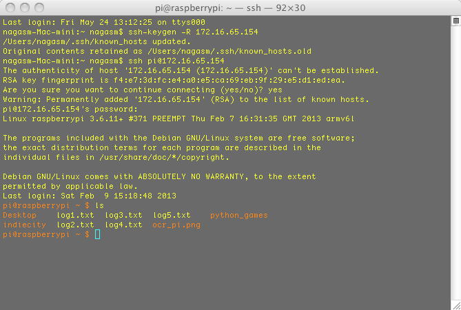 これまた謎である。 このIPはたぶん初めての登録なのに、今度は「-X」を付けずに、つまり以前に駄目だった方法でも出来てしまったのである。 違いがあるとすれば、今回はRaspberry Piがssh元のコンピュータを既に認識している、という可能性ぐらいである。 まぁ、とりあえず出来てしまったので、これ以上の深入りはナシにしよう。
