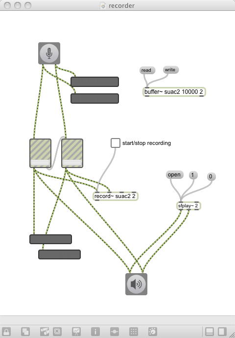 サウンドの再生パッケージは既にインストールされている筈だ、ということで、以下のように「sudo apt-get install alsa-utils」と入れると、無事に確認できた。 もし入っていなければ、「apt-get」がまたインターネットに捜しに旅立つところであった。(^_^;)pi@raspberrypi ~ $ pi@raspberrypi ~ $ sudo lsmod Module Size Used by snd_bcm2835 15846 0 snd_pcm 77560 1 snd_bcm2835 snd_seq 53329 0 snd_timer 19998 2 snd_pcm,snd_seq snd_seq_device 6438 1 snd_seq snd 58447 5 snd_bcm2835,snd_timer,snd_pcm,snd_seq,snd_seq_device snd_page_alloc 5145 1 snd_pcm leds_gpio 2235 0 led_class 3562 1 leds_gpio joydev 9316 0 evdev 9426 6 pi@raspberrypi ~ $これでいよいよ、サウンド再生のテストである。 Max6で3分ほどかけて作った以下のレコーディングツールを使って、 以下のコマンドで、無事に女性の声で「Front, Center」という声が聞こえてきた(^_^)。 こんな音である。pi@raspberrypi ~ $ sudo apt-get install alsa-utils パッケージリストを読み込んでいます... 完了 依存関係ツリーを作成しています 状態情報を読み取っています... 完了 alsa-utils はすでに最新バージョンです。 アップグレード: 0 個、新規インストール: 0 個、削除: 0 個、保留: 0 個。 pi@raspberrypi ~ $
