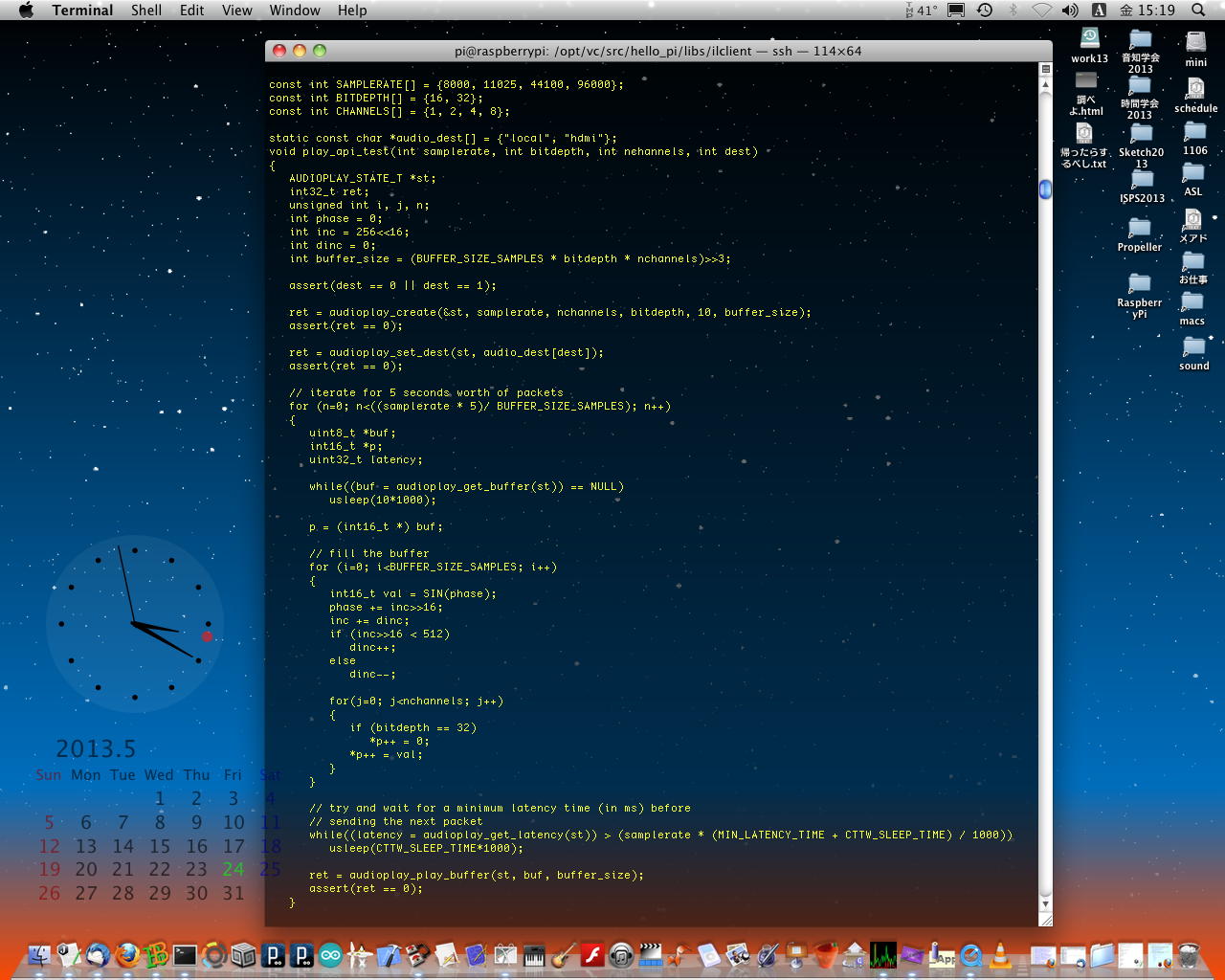 そして次は、「hello_audio」というテスト用のパッケージである。 おまじないの連続であるが(^_^;)、まずは「cd /opt/vc/src/hello_pi/libs/ilclient」へ行け、という。 ここには以下のものがあり、Makefileの内容は以下である。pi@raspberrypi ~ $ sudo aplay /usr/share/sounds/alsa/Front_Center.wav 再生中 WAVE '/usr/share/sounds/alsa/Front_Center.wav' : Signed 16 bit Little Endian, レート 48000 Hz, モノラル pi@raspberrypi ~ $ここで、各プログラムの中身は、 ilclient.h と ilclient.c と ilcore.c である。 ここで「make」とすると、 こんな表示 が出た。 続いて、「cd ../../hello_audio」へ行け、という。 ここには以下のものがあり、Makefileの内容は以下である。pi@raspberrypi ~ $ cd /opt/vc/src/hello_pi/libs/ilclient pi@raspberrypi /opt/vc/src/hello_pi/libs/ilclient $ ls Makefile ilclient.c ilclient.h ilcore.c pi@raspberrypi /opt/vc/src/hello_pi/libs/ilclient $ cat Makefile OBJS=ilclient.o ilcore.o LIB=libilclient.a include ../../Makefile.include pi@raspberrypi /opt/vc/src/hello_pi/libs/ilclient $ここで、各プログラムの中身は、 audioplay.h と audio.c と sinewave.c である。 ここで「make」とすると、 こんな表示 が出た。 ここでふーみん本には「./hello_audio 0」でサウンドが鳴る、とあったが以下のようにエラーで怒られた(^_^;)。 正解は「./hello_audio.bin 0」であり、 こんな音がした。pi@raspberrypi /opt/vc/src/hello_pi/libs/ilclient $ cd ../../hello_audio pi@raspberrypi /opt/vc/src/hello_pi/hello_audio $ ls Makefile audio.c audioplay.h hello_audio.bin sinewave.c pi@raspberrypi /opt/vc/src/hello_pi/hello_audio $ cat Makefile OBJS=audio.o sinewave.o BIN=hello_audio.bin LDFLAGS+=-lilclient include ../Makefile.include pi@raspberrypi /opt/vc/src/hello_pi/hello_audio $ふーみん本のバグ発見でちょっとだけでも貢献できたとしたら・・・嬉しい(^_^)。 この音 の作り方としては、 audio.c の中の、以下の部分ということになる。 C言語だと安心して読めるなぁ。pi@raspberrypi /opt/vc/src/hello_pi/hello_audio $ ./hello_audio 0 -bash: ./hello_audio: そのようなファイルやディレクトリはありません pi@raspberrypi /opt/vc/src/hello_pi/hello_audio $ ls Makefile audio.c audioplay.h hello_audio.bin sinewave.c pi@raspberrypi /opt/vc/src/hello_pi/hello_audio $ ./hello_audio.bin 0 Outputting audio to analogue pi@raspberrypi /opt/vc/src/hello_pi/hello_audio $