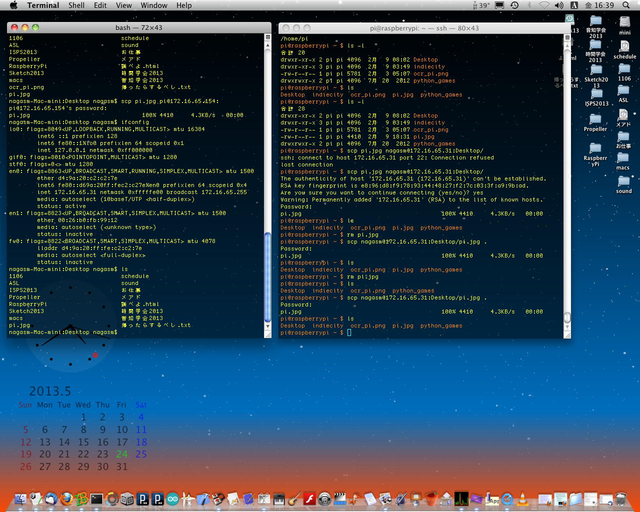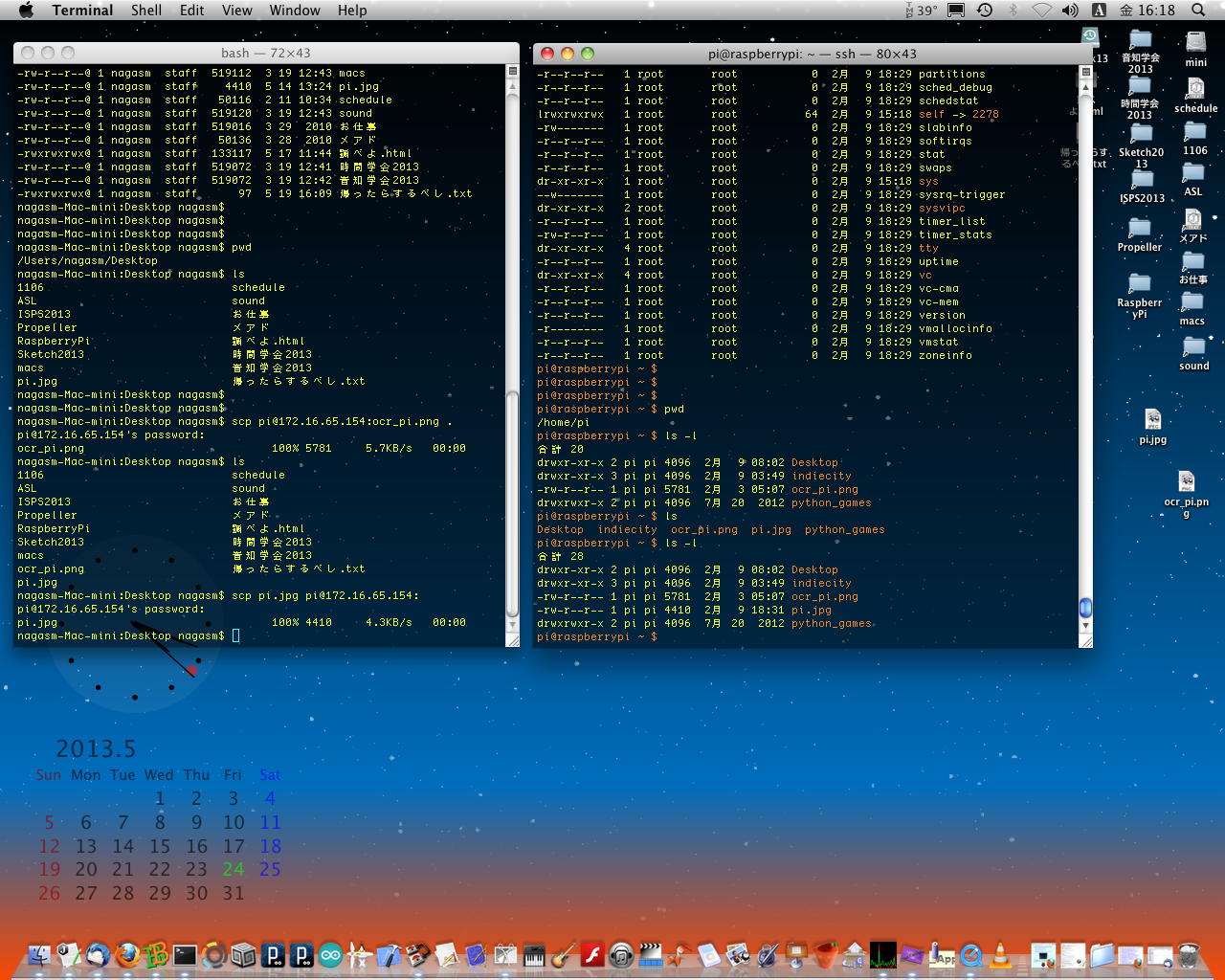 そしていよいよ、ふーみん本のトピックが「外部入出力」になった。 ここから残りの部分がメインである。 これは昨日メモした このリスト とも関係してくる世界である(^_^)。 ただし、実際にRaspberry PiのGPIOコネクタから外部に信号線を引き出して・・・という作業をするには、明日から2日間の出張を前にして、あと1時間ほどとなった今日は適さない(^_^;)。 そこで、「rcp」コマンドを調べて実験した。 以下のような手順で、ホストのMac内にターミナルウインドウを2つ開けて、片方はRaspberry Piにsshでログインしておき、もう片方はホストのMacを管理すると、それぞれのコンピュータ内のデータをネットワーク経由で自在にコピー出来るのである。