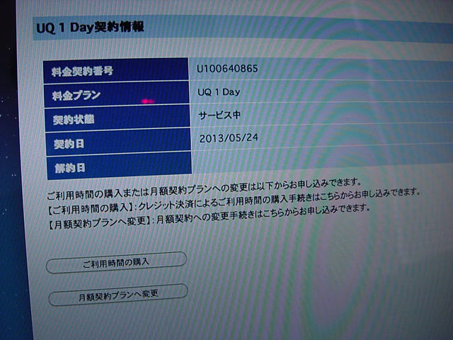 ただし、この画面が出たところでストップしていて、つまり契約は出来ているが「1 day」課金をスタートしていないので、実際にネットには出て行っていない。 実験で「1-day」使用を3-4日も続ければ2000円とかになるので、いっそのこと「従量コース」か「1ヶ月定額コース」に移行してしまってもいいのだが、コース移行すると、さらに移行するには解約手数料とかがかかりそうで、なんとも悩ましい。(^_^;)