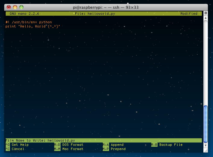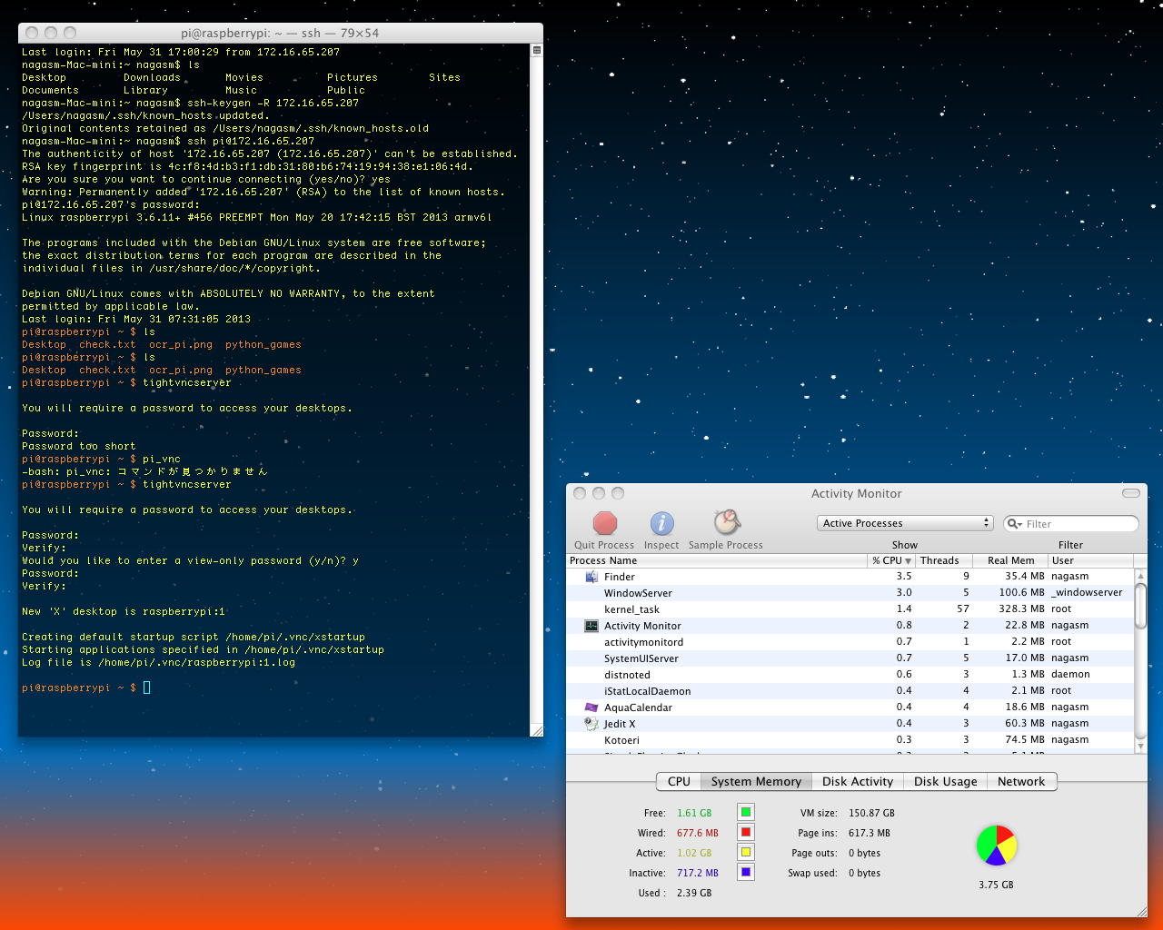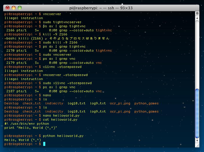 さて困った。 インストールに問題は無くなったものの、まだ「tightvncserver」は起動できない。 tightvncserverの起動はインプレス本では「vncserver」と書かれているが、いずれにしても、最初の起動で求められる筈のパスワード設定に来ない。 昨日の実験でサクサクと出来た、市販の「Real VNC」とはえらい違いである(^_^;)。 ここはまたまた、ふーみんヘルプの出番かなぁ。pi@raspberrypi ~ $ ls Desktop check.txt indiecity log10.txt log9.txt ocr_pi.png python_games pi@raspberrypi ~ $ rcp log10.txt nagasm@172.16.65.31:Desktop/ Password: log10.txt 100% 18KB 18.4KB/s 00:00 pi@raspberrypi ~ $ tightvncserver Illegal instruction pi@raspberrypi ~ $ x11vnc -storepasswd Illegal instruction pi@raspberrypi ~ $ tightvncserver -storepasswd Illegal instruction pi@raspberrypi ~ $ vncserver Illegal instruction pi@raspberrypi ~ $ vncserver -storepasswd Illegal instruction pi@raspberrypi ~ $ sudo tightvncserver pi@raspberrypi ~ $ ps ax | grep tightvnc 2166 pts/1 S+ 0:00 grep --color=auto tightvnc pi@raspberrypi ~ $ kill -9 2166 -bash: kill: (2166) - そのようなプロセスはありません pi@raspberrypi ~ $ sudo kill -9 2166 pi@raspberrypi ~ $ ps ax | grep tightvnc 2170 pts/1 S+ 0:00 grep --color=auto tightvnc pi@raspberrypi ~ $ sudo vncserver pi@raspberrypi ~ $ ps ax | grep vnc 2179 pts/1 S+ 0:00 grep --color=auto vnc pi@raspberrypi ~ $ sudo x11vnc -storepasswd pi@raspberrypi ~ $ ps ax | grep vnc 2187 pts/1 S+ 0:00 grep --color=auto vnc pi@raspberrypi ~ $ふーみん師匠にメイルを出してしまえば、とりあえず何をするかは決めていた。 Raspberry Piには、Pythonというインタプリタ言語環境があり、将来的に周辺回路とやりとりする際にも、速度などの条件を別にすればPythonベースのライブラリが充実しているとのことだったので、とりあえずこれを試してみることにした。 この部分のテキストは、インプレス本の「速習 : Python」であり、もちろんRaspberry Piはデスクトップなど起動せず、sshしたMac側での作業である。 以下のように、Macのターミナルでnanoを起動すると、ちゃんとテキストエディタになり、ctrl+Xで戻ることも確認した。