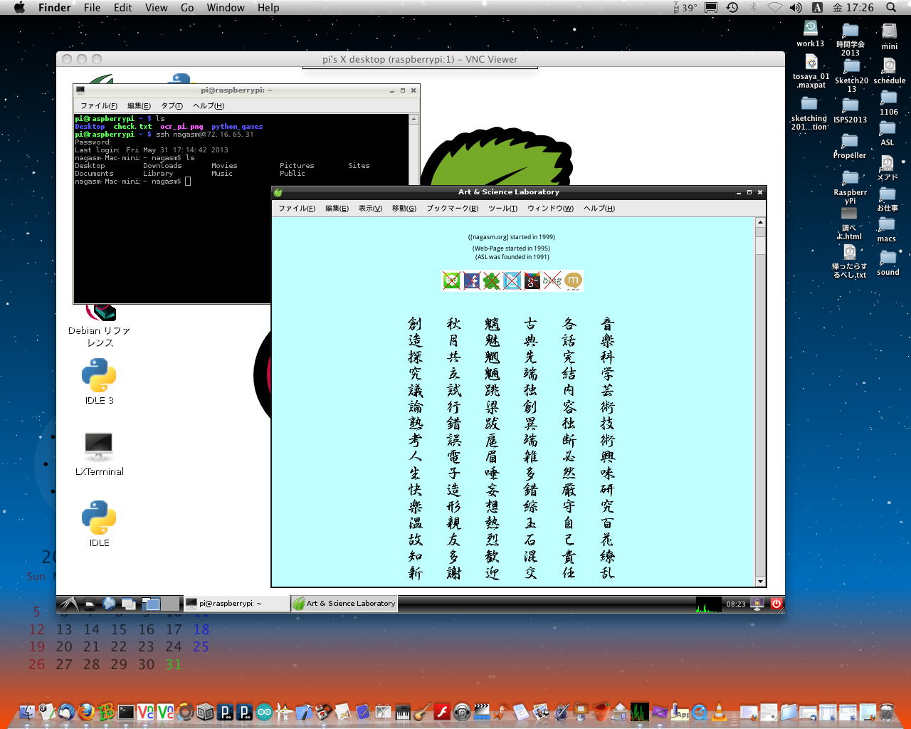 そしてそして、遂に、出来た。 5限には「第40期・虎の穴」のメンバーのうち6人が研究室に来て、熱心に「世界の名作CM傑作選」の映像に注視する中、ミーティング開始の18時の25分前になって、sshのリモート画面から「tightvncserver」を起動してパスワードを設定し、遂に以下のように画面にRaspberry Piのデスクトップが登場した。 思いのほか高速で、Raspberry PiのターミナルからMacに対してsshでログインしていて、またブラウザはちゃんとSUACのプロキシを経由して僕のサイトをアクセスし、EUC-JPの文字コードを全て正しく日本語表示している。 ここまで長かったが、これで準備は万端である。(^_^)■sshの古いキーの削除方法■ ・Finderの「Go」の「Go to Folder」で「/Users/nagasm/.ssh」とする ・「known_hosts」を開いて該当IPの部分を削除して上書きするとりあえず、ふーみんに「出来ました」とメイルして、あとは「40虎」ミーティングに集中しよう。 40虎については、全員が揃ったところで発表する大ニュースもある。 名人戦は夕食を前にして、森内名人の防衛、というところも確認した。