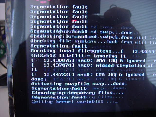 なるほど、ライブラリを入れたら、依存関係にある元ライブラリも全て更新しないといけないわけである。 さっそくやってみると、「503個、306MBのアーカイブを取得するぞ」、と表示され、モバイルWiFiルータの伝送速度の上限で連続してガリガリガリ・・・と猛烈にデータを取りに出かけた。うーむ、とりあえず sudo apt-get upgrade してみるとどうなるでしょう? x11vncで同様の事例が5/26付けで海外のサイトに出ていました。 長嶋さんのところではtightvncとx11vncの両方が同じ症状を 示してるので、共通に使っているライブラリのバージョンに問題が あるのかもしれません。そして30分以上が経過して、事態は急展開した(^_^;)。 上記の「sudo apt-get upgrade」の膨大なメッセージはターミナルアプリのコピーペーストバッファから溢れるほどだったが、これを一部切れた状態でなんとかログファイルにして保存して、sudoでシャットダウンした。 そしてLANケーブルを研究室内DHCPに差し替えて再起動したところで、以下のように異常が発生した(^_^;)。