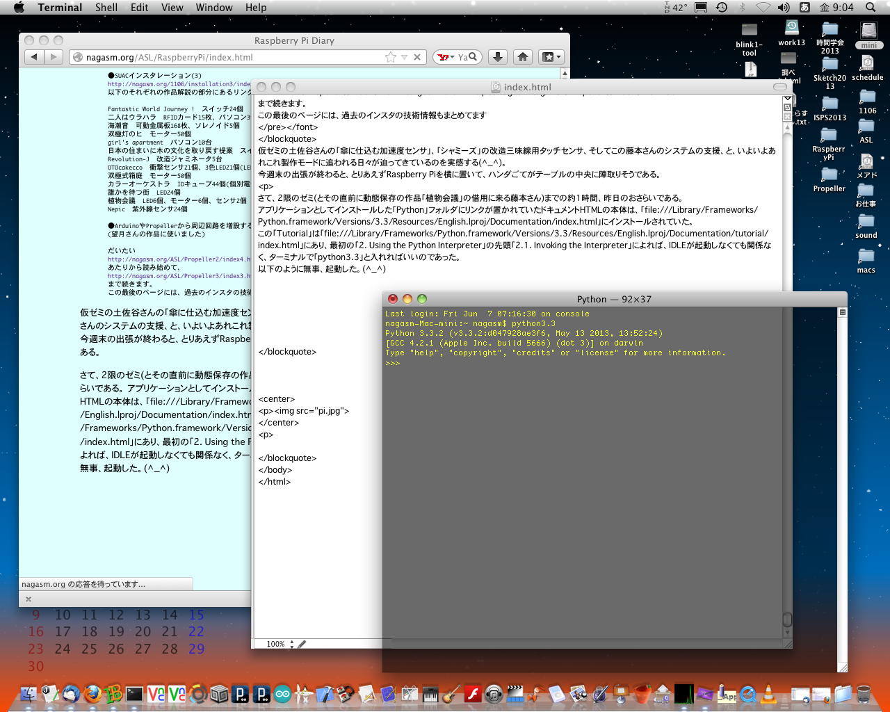朝は久しぶりの小雨だったが、午後から山口に出発する頃には晴れて、あとは週末まで晴れそうである。 1限の終わりにアポを入れていた4回生の藤本さんとメイルで何往復かしたが、前回の作品「植物会議」( ★ ★ ★ ) の続編として、今度は50個ほどのLEDとモーターを付けるのだという(^_^;)。 これは「SUAC board」の出番だと思うが、とりあえず以下のようにメイルしてみた。仮ゼミの土佐谷さんの「傘に仕込む加速度センサ」、「しゃみーず」の改造三味線用タッチセンサ、そしてこの藤本さんのシステムの支援、と、いよいよあれこれ製作モードに追われる日々が迫ってきているのを実感する(^_^)。 今週末の出張が終わると、とりあえずRaspberry Piを横に置いて、ハンダごてがテーブルの中央に陣取りそうである。インスタで多数の入出力の事例を以下に紹介しますので、来週までに研究してみて下さい。 ●SUACインスタレーション(1) http://nagasm.org/1106/installation/index.html 以下のそれぞれの作品解説の部分にあるリンクを参照 靄夜(もや) LED64個 Chessでポン! スイッチ64個 段虎 LED240個 磨く LED168個 ハコロ スイッチ24個 ●SUACインスタレーション(2) http://nagasm.org/1106/installation2/index.html 以下のそれぞれの作品解説の部分にあるリンクを参照 風見屏風(かざみびょうぶ) モーター100個 Cyber Kendang LED320個 Beat Box スイッチ384個 Octagon パソコン8台 circles LED168個 団欒 -だんらん- タッチスイッチ8個 白い絵本 RFIDカード15枚、磁気センサ5個 電子十二影坊 (Dodeca Propeller) マイコン13個、ビデオ12系統 はやくスシになりたい RFIDカード15枚 おはなしパネル RFIDセンサ(15枚用)×4系統 OTOkakecco マウス4個 ネジマキウォール ステッピングモーター100個(モーター400回路分) ●SUACインスタレーション(3) http://nagasm.org/1106/installation3/index.html 以下のそれぞれの作品解説の部分にあるリンクを参 Fantastic World Journey ! スイッチ24個 二人はウラハラ RFIDカード15枚、パソコン3台 海潮音 可動金属板168枚、ソレノイド5個 双極灯のヒ モーター50個 girl's apartment パソコン10台 日本の住まいに木の文化を取り戻す提案 スイッチ25個 Revolution-J 改造ジャミネータ5台 OTOcakecco 衝撃センサ21個、3色LED21個(LED63個分) 双極式箱庭 モーター50個 カラーオーケストラ IDキューブ44個(個別電子回路内蔵) 誰かを待つ街 LED24個 植物会議 LED6個、モーター6個、センサ2個 Nepic 紫外線センサ24個 ●ArduinoやPropellerから周辺回路を増設するために僕が作った基板の情報です (望月さんの作品に使いました) だいたい http://nagasm.org/ASL/Propeller2/index4.html あたりから読み始めて、 http://nagasm.org/ASL/Propeller3/index3.html まで続きます。 この最後のページには、過去のインスタの技術情報もまとめてますさて、2限のゼミ(とその直前に動態保存の作品「植物会議」の借用に来る藤本さん)までの約1時間、昨日のおさらいである。 アプリケーションとしてインストールした「Python」フォルダにリンクが置かれていたドキュメントHTMLの本体は、「file:///Library/Frameworks/Python.framework/Versions/3.3/Resources/English.lproj/Documentation/index.html」にインストールされていた。 この「Tutorial」は「file:///Library/Frameworks/Python.framework/Versions/3.3/Resources/English.lproj/Documentation/tutorial/index.html」にあり、最初の「2. Using the Python Interpreter」の先頭「2.1. Invoking the Interpreter」によれば、IDLEが起動しなくても関係なく、ターミナルで「python3.3」と入れればいいのであった。 以下のように無事、起動した。(^_^)