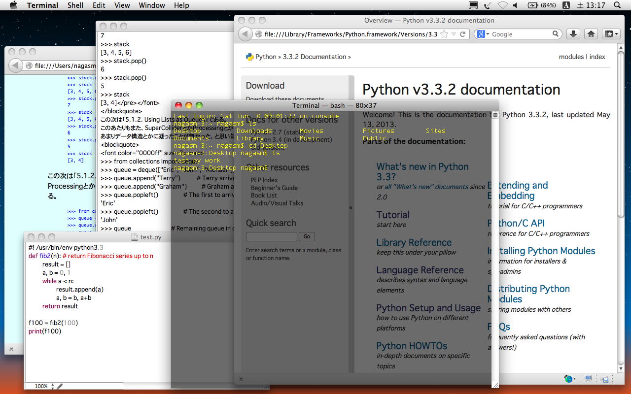ただしこれは、以下のようにしても同様だという。 なんか凄い、これは半変態的である。nagasm-3:Desktop nagasm$ cat test.py #! /usr/bin/env python3.3 squares = [] for x in range(10): squares.append(x**2) print(squares) nagasm-3:Desktop nagasm$ Python test.py [0, 1, 4, 9, 16, 25, 36, 49, 64, 81] nagasm-3:Desktop nagasm$上の「squares = [x**2 for x in range(10)]」というのは、「squares = list(map(lambda x: x**2, range(10)))」とやっても同じだが、より判りやすいだろう、と言っている。 まぁ、変態の自画自賛である(^_^;)。 そして、このかつての「Unixスクリプトオタク」の世界は、以下の例でもテキメンである。 以下の、上の方が論理を追いやすいが、これは以下の下の方でも出来る、という事らしい。nagasm-3:Desktop nagasm$ cat test.py #! /usr/bin/env python3.3 squares = [x**2 for x in range(10)] print(squares) nagasm-3:Desktop nagasm$ Python test.py [0, 1, 4, 9, 16, 25, 36, 49, 64, 81] nagasm-3:Desktop nagasm$なんだか、ツイッターになぞらえてトリッキーなスクリプトで複雑なサウンドを生成するSuperColliderのオタクを彷彿とさせる例であるが、ここもあまり近づかずに行きたい(^_^;)。 さらに、以下のような色々なテクニックも紹介されていた。nagasm-3:Desktop nagasm$ cat test.py #! /usr/bin/env python3.3 combs = [] for x in [1,2,3]: for y in [3,1,4]: if x != y: combs.append((x, y)) print(combs) print([(x, y) for x in [1,2,3] for y in [3,1,4] if x != y]) nagasm-3:Desktop nagasm$ Python test.py [(1, 3), (1, 4), (2, 3), (2, 1), (2, 4), (3, 1), (3, 4)] [(1, 3), (1, 4), (2, 3), (2, 1), (2, 4), (3, 1), (3, 4)] nagasm-3:Desktop nagasm$以下の例は、πの小数点以下の精度を再帰的に増やしたものである。 あまりにトリッキーだが、これで出来るというのは素晴らしい。 (結果が長いので手作業で改行していることに注意)>>> vec = [-4, -2, 0, 2, 4] >>> # create a new list with the values doubled >>> [x*2 for x in vec] [-8, -4, 0, 4, 8] >>> # filter the list to exclude negative numbers >>> [x for x in vec if x >= 0] [0, 2, 4] >>> # apply a function to all the elements >>> [abs(x) for x in vec] [4, 2, 0, 2, 4] >>> # call a method on each element >>> freshfruit = [' banana', ' loganberry ', 'passion fruit '] >>> [weapon.strip() for weapon in freshfruit] ['banana', 'loganberry', 'passion fruit'] >>> # create a list of 2-tuples like (number, square) >>> [(x, x**2) for x in range(6)] [(0, 0), (1, 1), (2, 4), (3, 9), (4, 16), (5, 25)] >>> # flatten a list using a listcomp with two 'for' >>> vec = [[1,2,3], [4,5,6], [7,8,9]] >>> [num for elem in vec for num in elem] [1, 2, 3, 4, 5, 6, 7, 8, 9]そして次は「5.1.4. Nested List Comprehensions」ということで、多次元の配列、あるいは配列のネスティングである。 Maxのjitterは64次元配列なので、あまり驚くことはないのだが、完結にまとめる記述法の変態度はアップしている。 以下の2つは同じだという。nagasm-3:Desktop nagasm$ cat test.py #! /usr/bin/env python3.3 from math import pi print([str(round(pi, i)) for i in range(1, 13)]) nagasm-3:Desktop nagasm$ Python test.py ['3.1', '3.14', '3.142', '3.1416', '3.14159', '3.141593', '3.1415927', '3.14159265', '3.141592654', '3.1415926536', '3.14159265359', '3.14159265359'] nagasm-3:Desktop nagasm$そして最後の例として、以下の3つは全て同等だという。 同じことを色々に表現できるのがプログラミングなのだが、これはちょっとやり過ぎではないのか(^_^;)。nagasm-3:Desktop nagasm$ cat test.py #! /usr/bin/env python3.3 matrix = [ [1, 2, 3, 4], [5, 6, 7, 8], [9, 10, 11, 12], ] print(matrix) print([[row[i] for row in matrix] for i in range(4)]) nagasm-3:Desktop nagasm$ Python test.py [[1, 2, 3, 4], [5, 6, 7, 8], [9, 10, 11, 12]] [[1, 5, 9], [2, 6, 10], [3, 7, 11], [4, 8, 12]] nagasm-3:Desktop nagasm$ようやく配列シリーズが終わり、次は「5.2. The del statement」である。 リストから特定の要素をdeleteすると、以下のようにちゃんとリストは縮んでくれる、という事のようである。nagasm-3:Desktop nagasm$ cat test.py #! /usr/bin/env python3.3 matrix = [ [1, 2, 3, 4], [5, 6, 7, 8], [9, 10, 11, 12], ] transposed1 = [] for i in range(4): transposed1.append([row[i] for row in matrix]) print(transposed1) transposed2 = [] for i in range(4): transposed_row = [] for row in matrix: transposed_row.append(row[i]) transposed2.append(transposed_row) print(transposed2) print(list(zip(*matrix))) nagasm-3:Desktop nagasm$ Python test.py [[1, 5, 9], [2, 6, 10], [3, 7, 11], [4, 8, 12]] [[1, 5, 9], [2, 6, 10], [3, 7, 11], [4, 8, 12]] [(1, 5, 9), (2, 6, 10), (3, 7, 11), (4, 8, 12)] nagasm-3:Desktop nagasm$また、「del a」とすれば、変数「a」そのものも抹消してくれるという。 この次の「5.3. Tuples and Sequences」は、リファレンスとして「Sequence Types ― list, tuple, range」を引け、という膨大なものだったので、以下の例をコピペするのみでパスである。「Tuples」というのは、数値とテキストとをまとめて一つの塊に扱うというようなものらしい。>>> a = [-1, 1, 66.25, 333, 333, 1234.5] >>> del a[0] >>> a [1, 66.25, 333, 333, 1234.5] >>> del a[2:4] >>> a [1, 66.25, 1234.5] >>> del a[:] >>> a []そして次は「5.4. Sets」、集合である。 なんとPythonでは、以下のように集合の要素の確認だけでなく、要素間の引き算(取り除く)などの演算も出来るらしい。>>> t = 12345, 54321, 'hello!' >>> t[0] 12345 >>> t (12345, 54321, 'hello!') >>> # Tuples may be nested: ... u = t, (1, 2, 3, 4, 5) >>> u ((12345, 54321, 'hello!'), (1, 2, 3, 4, 5)) >>> # Tuples are immutable: ... t[0] = 88888 Traceback (most recent call last): File "", line 1