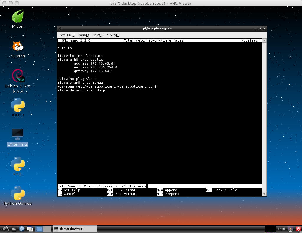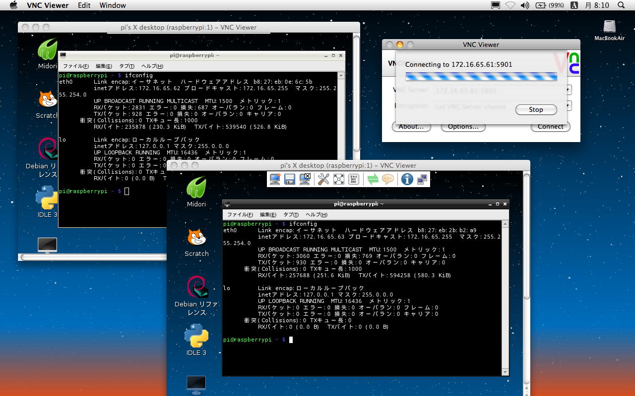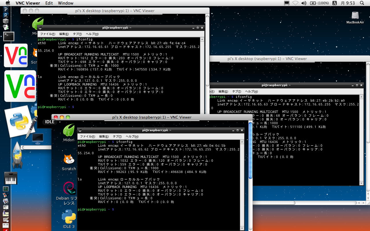 研究室LANから分離されたという事は、SUACネットのDHCPサーバと接続されていない状態である。 もちろんこのために、Air2号機のIPアドレスも固定で「172.16.65.32」と設定した。 すると上のように、3台のRaspberry Piに対して、ホストのAir2号機からそれぞれVNCで接続できた。 ただし、SSHは無反応で駄目であった。 おそらくSSHはDHCPサーバとやりとりしているのだろうが、とりあえずVNCベースでは、文字通りのローカルネットワークをMac+Raspberry Pi3台で構築できたことになる。 これは少なくとも自分としては、今後に向けて、幸先良い実験結果なのである。