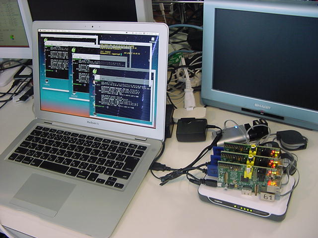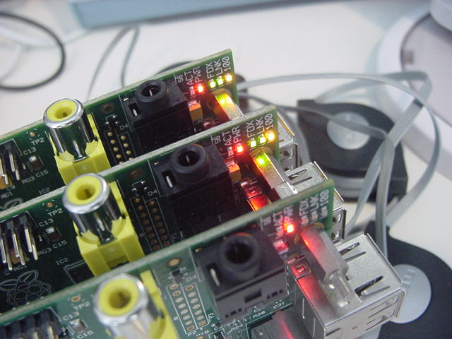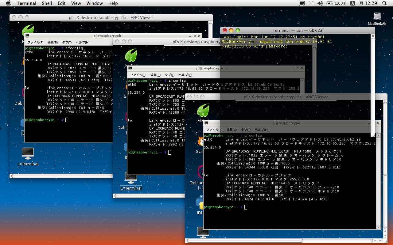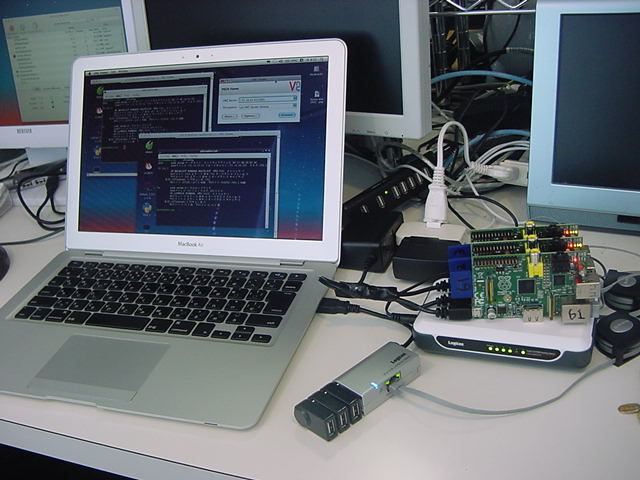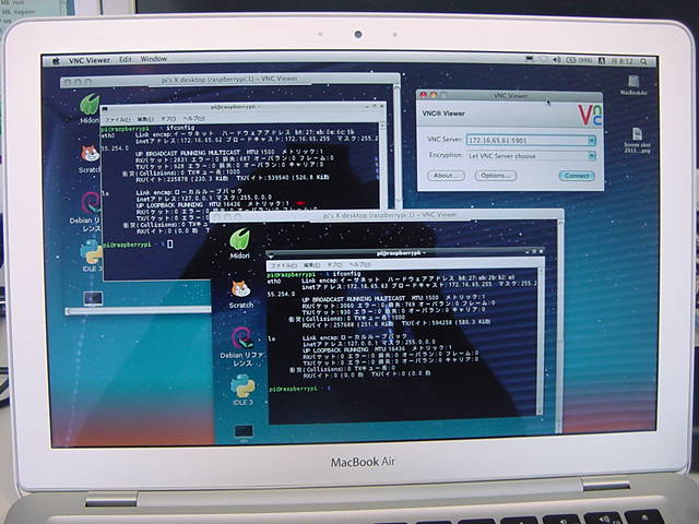・・・とここまで順調だったが、ここでトラブルが発生した。 以下のように、3台のRaspberry Piのうち、IPアドレス「172.16.65.61」のマシン(これも今後のために「61号機」とか呼ぶことにしよう)の基板上のLEDが他の2台と異なり、どうやら静かに死んでいる模様である(^_^;)。 新しいAir2号機からVNCのアドレス登録とともにVNC接続すると、62号機と63号機はちゃんと応答したものの、61号機はVNCの接続待ちのままストップした。 最初はSSHで接続できたが、この状態だとSSHでも繋がらなくなった。Last login: Mon Jun 17 07:23:23 on console MacBookAir-2:~ nagashima$ ls Desktop Downloads Movies Pictures Sites Documents Library Music Public MacBookAir-2:~ nagashima$ ssh pi@172.16.65.61 The authenticity of host '172.16.65.61 (172.16.65.61)' can't be established. RSA key fingerprint is 4c:f8:4d:b3:f1:db:31:80:b6:74:19:94:38:e1:06:4d. Are you sure you want to continue connecting (yes/no)? yes Warning: Permanently added '172.16.65.61' (RSA) to the list of known hosts. pi@172.16.65.61's password: Linux raspberrypi 3.6.11+ #456 PREEMPT Mon May 20 17:42:15 BST 2013 armv6l The programs included with the Debian GNU/Linux system are free software; the exact distribution terms for each program are described in the individual files in /usr/share/doc/*/copyright. Debian GNU/Linux comes with ABSOLUTELY NO WARRANTY, to the extent permitted by applicable law. Last login: Fri May 31 16:07:30 2013 pi@raspberrypi ~ $ ls Desktop ocr_pi.png python_games twilight.png pi@raspberrypi ~ $ exit ログアウト Connection to 172.16.65.61 closed. MacBookAir-2:~ nagashima$ ssh pi@172.16.65.62 The authenticity of host '172.16.65.62 (172.16.65.62)' can't be established. RSA key fingerprint is 4c:f8:4d:b3:f1:db:31:80:b6:74:19:94:38:e1:06:4d. Are you sure you want to continue connecting (yes/no)? yes Warning: Permanently added '172.16.65.62' (RSA) to the list of known hosts. pi@172.16.65.62's password: Linux raspberrypi 3.6.11+ #456 PREEMPT Mon May 20 17:42:15 BST 2013 armv6l The programs included with the Debian GNU/Linux system are free software; the exact distribution terms for each program are described in the individual files in /usr/share/doc/*/copyright. Debian GNU/Linux comes with ABSOLUTELY NO WARRANTY, to the extent permitted by applicable law. Last login: Fri May 31 16:42:30 2013 pi@raspberrypi ~ $ ls Desktop check.txt mess.txt ocr_pi.png python_games twilight.png pi@raspberrypi ~ $ rm check.txt pi@raspberrypi ~ $ ls Desktop mess.txt ocr_pi.png python_games twilight.png pi@raspberrypi ~ $ rm mess.txt pi@raspberrypi ~ $ ls Desktop ocr_pi.png python_games twilight.png pi@raspberrypi ~ $ exit ログアウト Connection to 172.16.65.62 closed. MacBookAir-2:~ nagashima$ ssh pi@172.16.65.63 The authenticity of host '172.16.65.63 (172.16.65.63)' can't be established. RSA key fingerprint is 4c:f8:4d:b3:f1:db:31:80:b6:74:19:94:38:e1:06:4d. Are you sure you want to continue connecting (yes/no)? yes Warning: Permanently added '172.16.65.63' (RSA) to the list of known hosts. pi@172.16.65.63's password: Linux raspberrypi 3.6.11+ #456 PREEMPT Mon May 20 17:42:15 BST 2013 armv6l The programs included with the Debian GNU/Linux system are free software; the exact distribution terms for each program are described in the individual files in /usr/share/doc/*/copyright. Debian GNU/Linux comes with ABSOLUTELY NO WARRANTY, to the extent permitted by applicable law. Last login: Fri May 31 17:27:53 2013 pi@raspberrypi ~ $ ls Desktop ocr_pi.png python_games twilight.png pi@raspberrypi ~ $ exit ログアウト Connection to 172.16.65.63 closed. MacBookAir-2:~ nagashima$