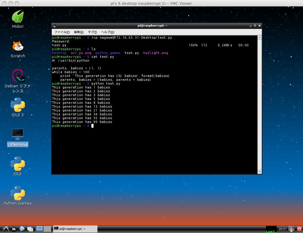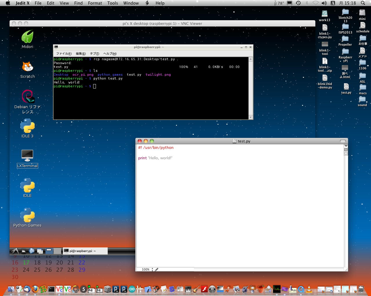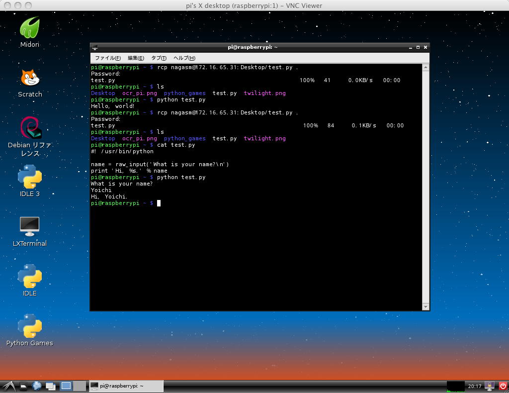 さて、そこでインブレス本のPython解説である。 ここに サンプルブログラムがたくさんある、というので、これをコピペしては試してみよう。 既にMacではやっていたが、あらためてHello Worldプログラム(test.py)をMac上で作り、これをVNC越しにRaspberry Piのターミナルからrcpでゲットして走らせたのが、 以下である。