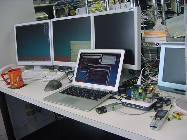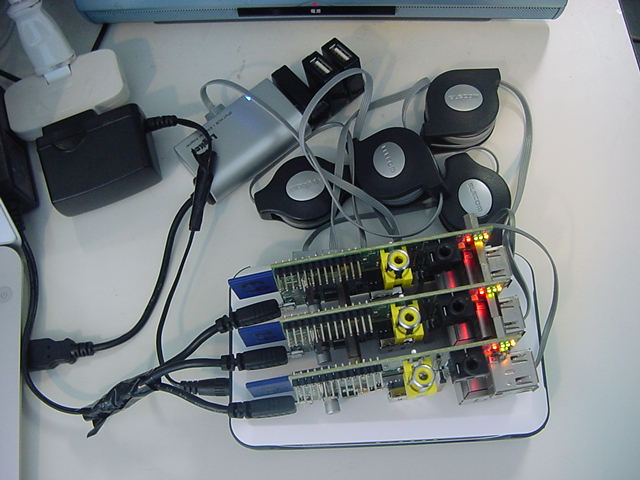 新しい週が始まった。5月はゴールデンウイークがあり、7月にも海の日があるが、6月は祝日も無く梅雨の時期で、学生は課題などに追われてあまり好きな季節ではないかもしれないが、コンスタントに仕事を進められるこの時期は嫌いではない。 今年はNIMEをスキップしていて静かな6月である。 Sketching2013の主催者であるMike Kuniavskyからは、今年の参加者に以下のようなメイルが届いた。 このメイルの末尾には、Googleやゼロックスに次いで、インテルもSketching2013のスポンサーに加わったとの情報もあった。 いよいよあと1ヶ月、参加者は皆んな、世界先端のスリリングな仕事を持って集まってくるので、こちらも負けずにあれこれ用意して臨みたい。さて、先週新しくゲットしたMacBookAir(これは今後、「Air2号機」とでも呼ぶことにしよう)の環境設定もあらかた出来たので、インストールしたVNCやターミナルの環境設定を確認するところからRaspberry Piを再開することにした。 まずは以下のように、新しく仕入れた小型LANハブとLANリールと改造ACアダプタでコンパクトに組み上げた。Our digital design tools help us think of things we would never have considered, before the tool gave us the ability to think of them (as per the ideas of distributed cognition). As these tools move into the cloud, these thoughts become increasingly social and the tools create a shared understanding of what's being designed, an understanding simultaneously shaped by the capabilities of the tools and the knowledge and skills of the people using them. Then these shared ideas have to become real, they have to be projected from virtual approximations to real designs, and everything changes again. The ability to instantiate ideas as actual objects still falls short of our tools' ability to imagine them. Sketching in Hardware this year will be about these interfaces: between people and their digital tools, between people and each other, and between virtual tools and physical tools. How do we project ideas from one to the other? BRINGING NEW TECHNOLOGY? +++++++++++++++++++++++ Are you bringing new things to show off? Please do, and please let me know. I'm making space in the schedule for a kind of "Science Fair" style that will give everyone an opportunity to get some in-depth experience with everyone else's new cool stuff. If you're considering bringing something to show and aren't sure if it's ready, just bring it and show what you have. Having nearly complete projects is as exciting as having the finished thing. But do let me know.