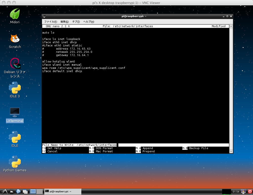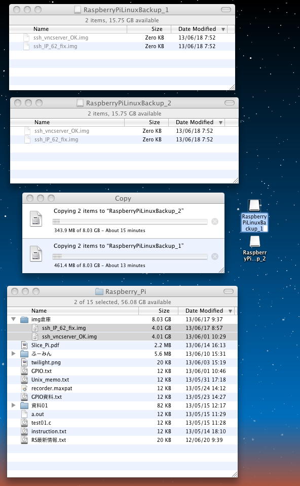 ここで重要なのは、ここまで63号機で進めてきて、まず一旦sudoでDHCPを固定IPに戻してシャットダウンして、研究室LANに戻してホストのMacとVNC出来たことを確認してまたシャットダウンして、そのSDカードのイメージデータを吸い上げた事である。 残りの61号機・62号機でまたいちいちWiFi経由で環境設定するのはナンなので、まずはこの段階を保持しておく、という事である。 ここまでで3限の時間が終わり、いったん「企画立案演習」に向かうこととなった。