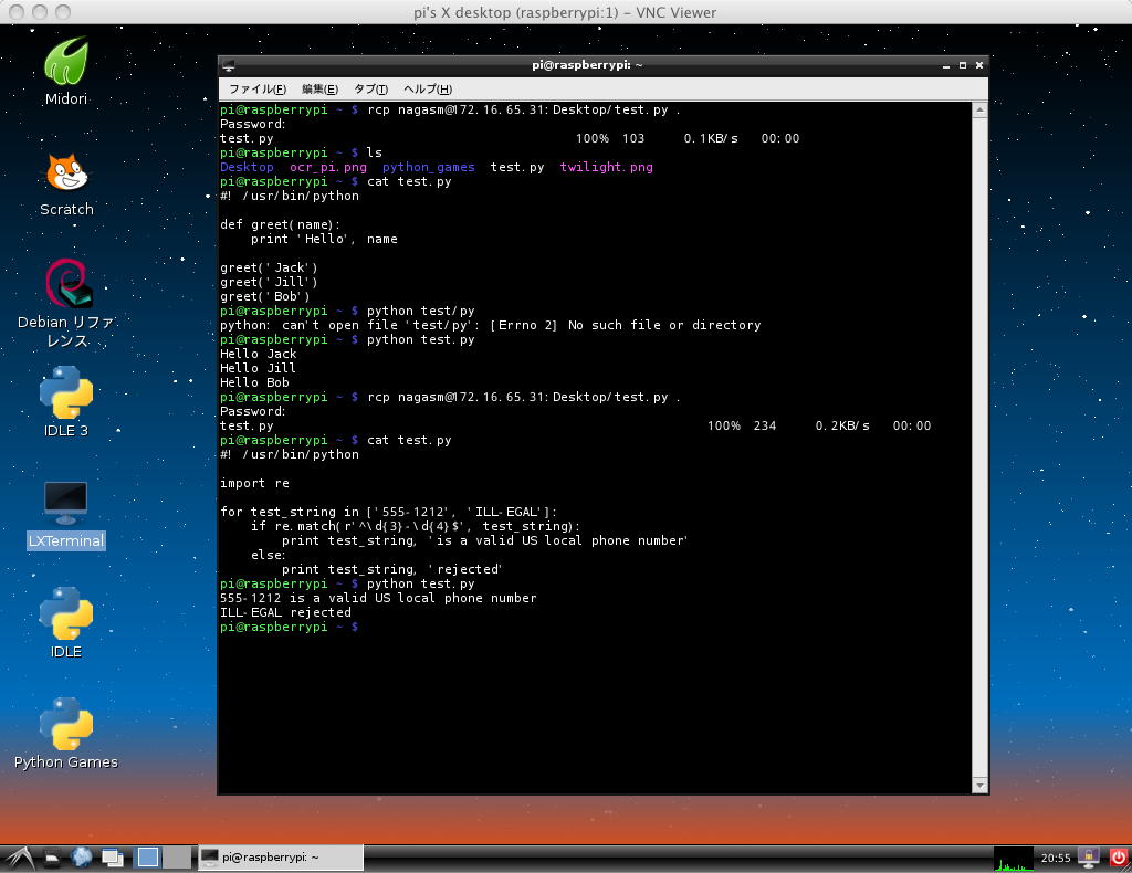 そして ここの 続きである。上の例は、「5 lines: Functions」と「6 lines: Import, regular expressions」をそれぞれ「test.py」に書き出して、Raspberry Piからrcpでゲットして走らせた模様の、VNC経由のスクリーンショットである。 まだこの程度であればここのページにPythonソースを置く程のこともないだろう。