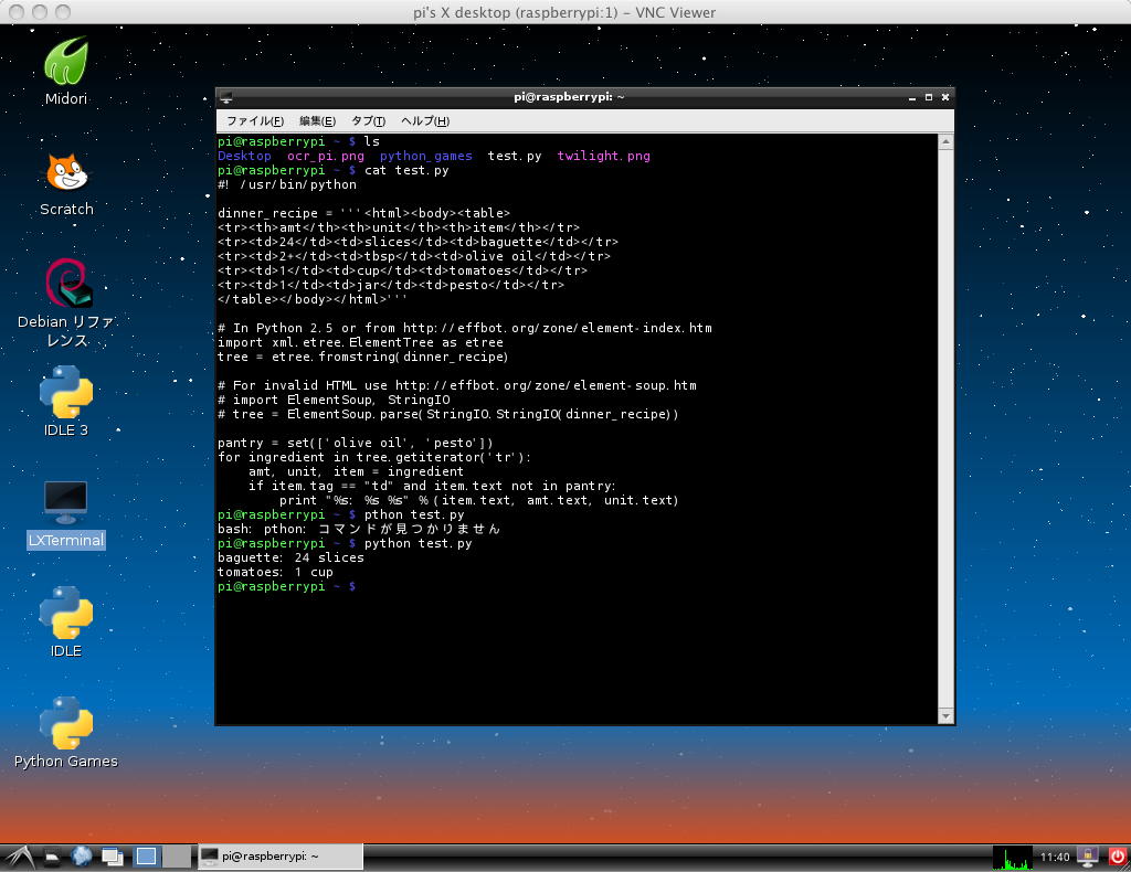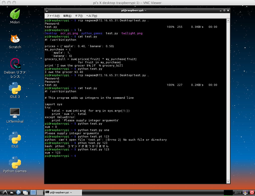 ・・・そして2限になったが、Raspberry Piはちゃんと生きていた(^_^;)。 どうやら、スクリーンセーバーもOFFにする設定にしていたようである。 こうなれば、もう この ページのサンプルをいちいちRaspberry Piに送って走らせて確認するだけである。 以下は「7 lines: Dictionaries, generator expressions」と「8 lines: Command line arguments, exception handling」をそれぞれ「test.py」に書き出して、Raspberry Piからrcpでゲットして走らせた模様の、VNC経由のスクリーンショットである。 プログラムの引き数として数値を渡すこの方法は、C言語のargcとargvと同じで、使えそうである。