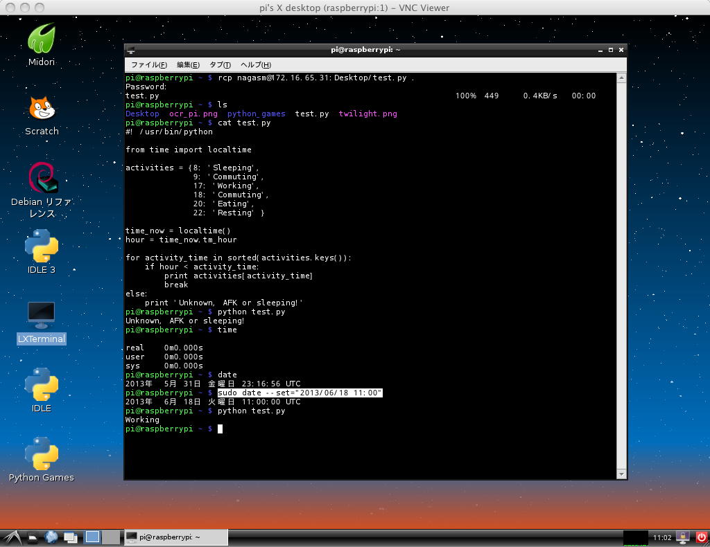 次の「9 lines: Opening files」はファイルのアクセスのようであるが、「f:」というのは邪悪なDOS系パソコンのようだったのでパスした(^_^;)。 以下は「10 lines: Time, conditionals, from..import, for..else」を「test.py」に書き出して、Raspberry Piからrcpでゲットして走らせた模様の、VNC経由のスクリーンショットである。 ネットで調べて、Linuxでの日付時刻の設定「sudo date --set="2013/16/18 11:00"」というのもついでに覚えて、時間帯によって変化する応答も確認できた。(^_^)