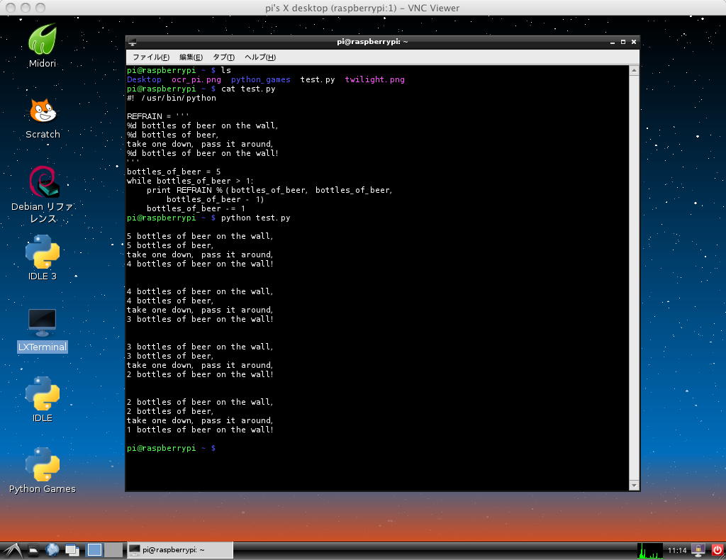 以下は「11 lines: Triple-quoted strings, while loop」を「test.py」に書き出して、Raspberry Piからrcpでゲットして走らせた模様の、VNC経由のスクリーンショットである。 最初は「bottles_of_beer = 99」ということで膨大な行が表示されてスクロールしたので(^_^;)、nanoで「bottles_of_beer = 5」と変更している。